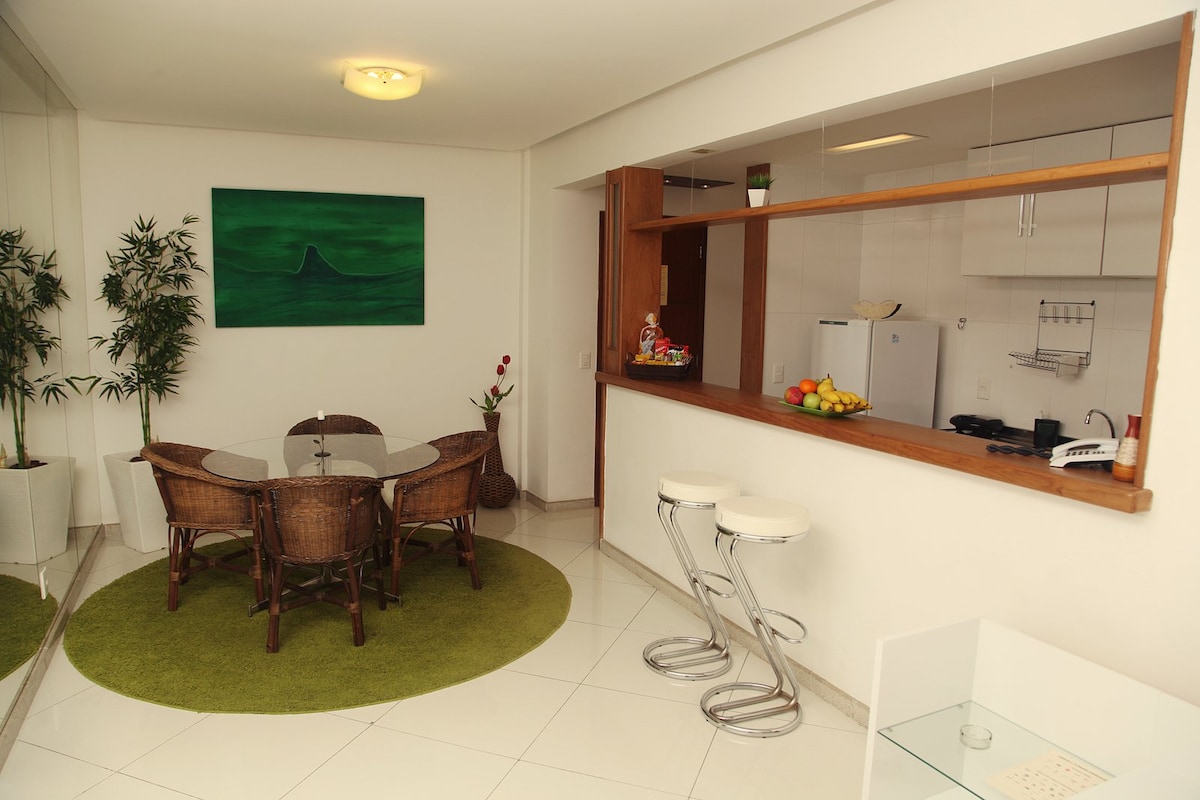 Relaxe e curta momentos neste espaço calmo e cheio de estilo. Localizado no condomínio de luxo do Apart Hotel Orizzonte esse loft conta com muito conforto e uma das vistas mais exclusivas e bonitas do Brasil. Apartamento em conceito aberto sala e cozinha, conta ainda com 1 quarto, closet , banheiro e 2 varandas debruçadas sobre um Cartão Postal. Apartamento equipado com 1 cama de casal Queen no quarto e 1 sofá cama de casal na sala . Microondas, geladeira, televisão e ar refrigerado no quarto