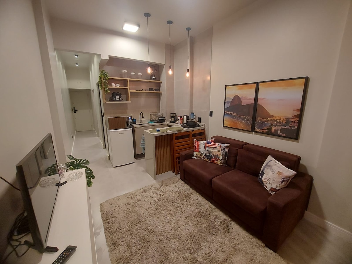 Este lindo Loft, muito novo, foi preparado para que sua estadia seja bastante aconchegante. Possui localização privilegiada, em Botafogo, com linda vista do Pão de Açúcar! Fica apenas a 5 min a pé, da praia, 5 min Botafogo Praia Shopping e 2 min do metro. Além de bares, restaurantes, bancos, academias e supermercados. O prédio possui portaria 24hrs e Mini mercado. Calmo e silêncioso. O Loft é equipado com utensílios domésticos, roupas de cama, toalhas e sabonete. Ar Split, SmartTv e Wi-Fi