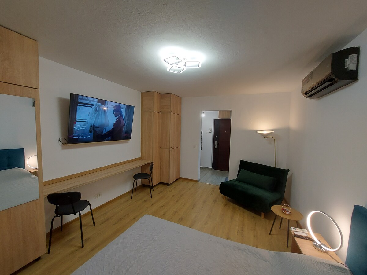 Welcome to your cozy getaway! Kick back and relax in this calm, stylish studio. My charming apartment features a comfortable 180x200 cm bed and is perfectly situated just 400 meters from the Iulius Town (5 minutes by foot) and 1km away from the historical and cultural city center. Iulius Town is the busiest place in the city. Here, you can find any restaurant you want, any café you like, and any store you want to shop in. It's really the place near you want to stay when you come to Timisoara