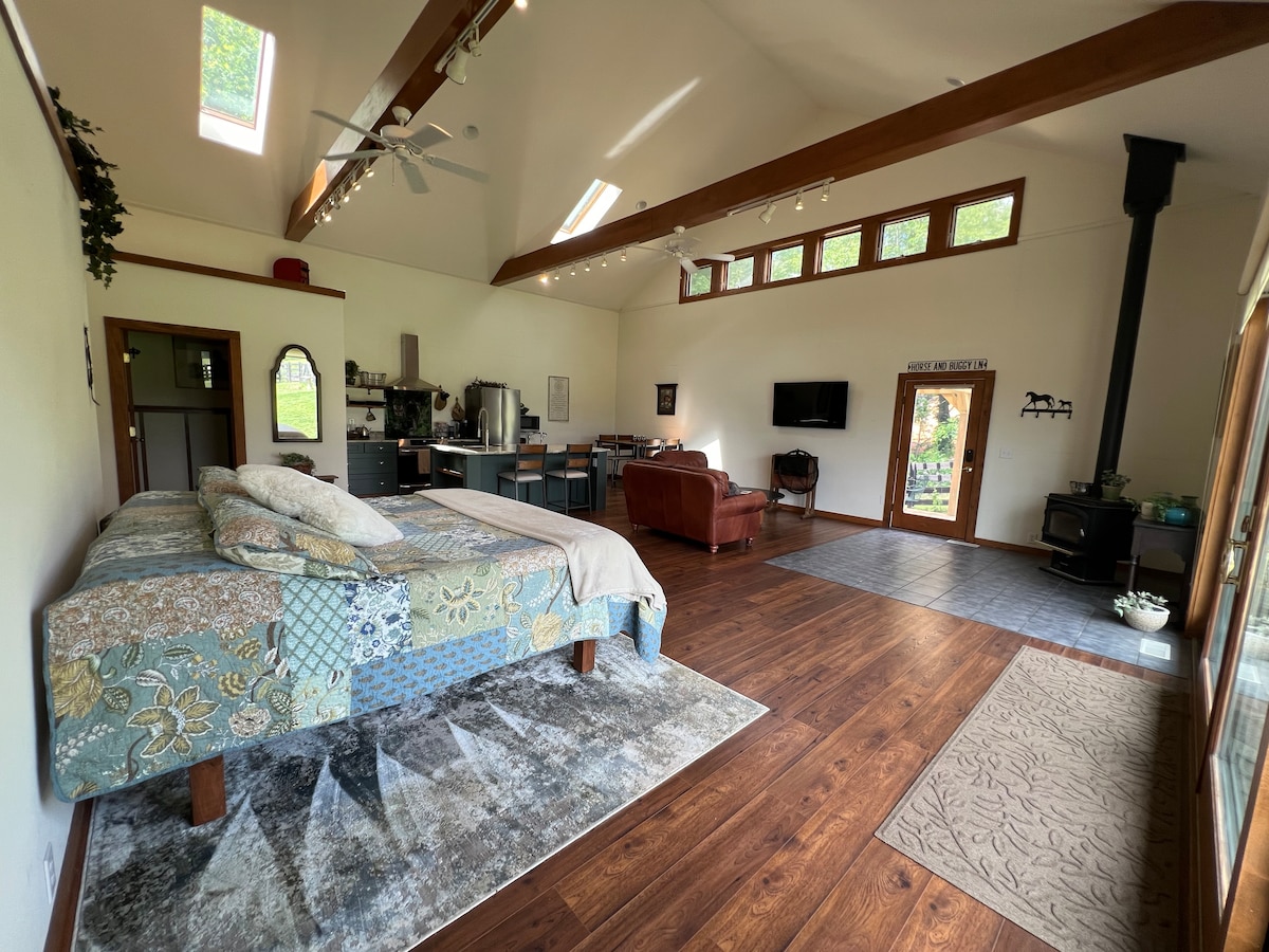 Take a scenic country drive from Lexington to the mountains to find a contemporary vaulted ceiling studio with stunning views from your living space! 900SqFt. private entrance studio and patio on a working horse farm with nearly 50 acres of private land, surrounded by the National Forest. This modern European designed studio was formerly an art studio, and is just 11.5 miles from Main Street Lexington. There's also an open high knoll for a perfect picnic spot, with 360 degree mountain views!