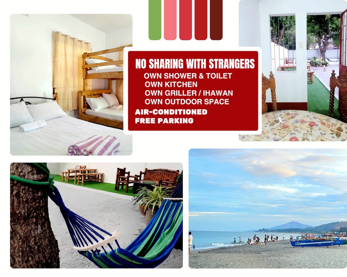 Sits directly on the West Philippine Sea. This cozy beach house has an insulated bedroom with 2 queen beds and a upper bunk for up to 6pax 7 yrs below are free of charge using existing beds. Air Conditioner, TV with movies includes free wireless internet access. Open sitting area overlooking the ocean and a kitchen and CR with hot water shower Simply fresh ocean breezes and sun and sand.