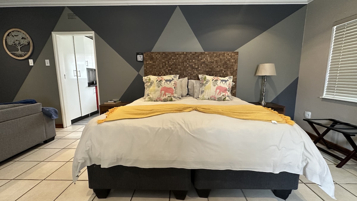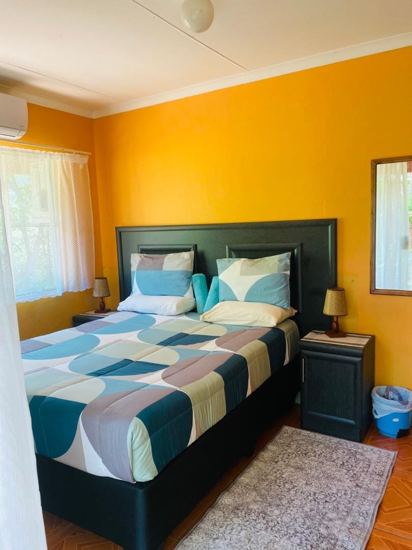 Guest house a few metres away from main house. It consist out of a big bedroom, small kitchen unit with fridge, microwave, two burner stove and a kettle. A small bathroom with shower, toilet and sink. The guest house has its own geyser, air conditioning, TV and fans and heater on demand. It also has a small private veranda. The washing machine can be used on demand for a small fee of P40 for each load. Guests should be animal friendly, big dogs, cats, rabbits and chickens on property.