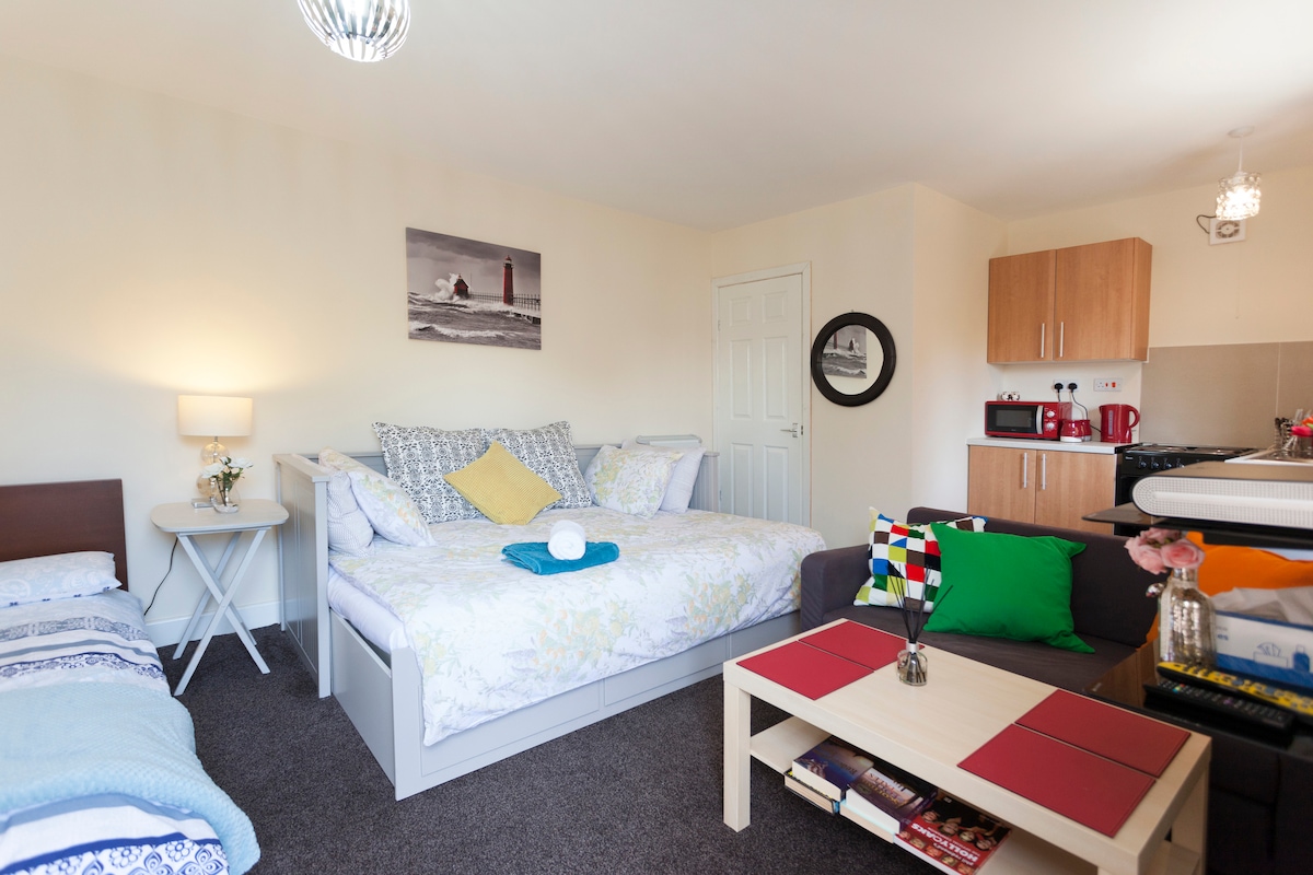 We have a furnished studio(annexe)with separate entrance of the house in garden area near City Centre,Railway station,Bus Station and Football and Cricket Grounds.Ideal location for staying in Nottingham.Buses and Trams are available to go anywhere in Nottingham.There are big food chains McDonalds,Pizza Hut and other restaurants near the house in Castle Marina Retail park., House is located in NG2 area that is almost near the centre of Nottingham.Studio is furnished with facilities. Thanks