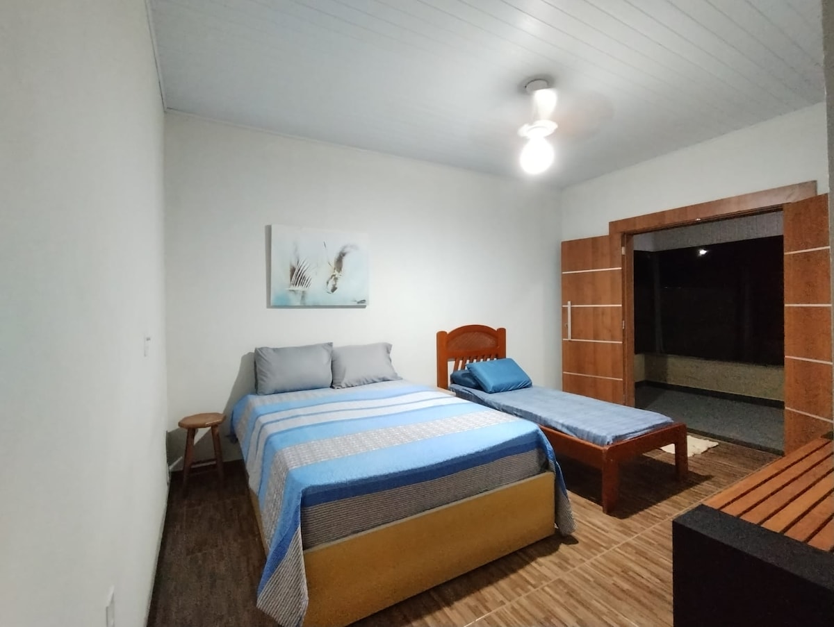 Quarto individual com uma cama de casal e uma cama de solteiro. Possui mesinha de apoio, armário e ventilador no teto. Fornecemos roupa de cama, cobertor e toalhas. Banheiro e cozinha compartilhados (externos ao quarto). Banheiro com chuveiro quente e cozinha com fogão, geladeira e utensílios básicos para cozinhar. Quartos com varanda e frente para a piscina.