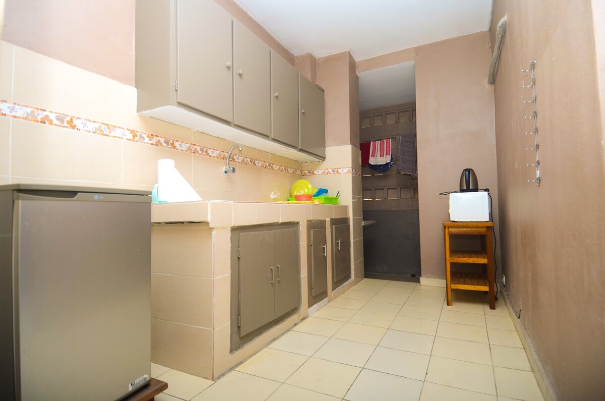 Il s'agit d'une villa de quatre pièces: un séjour + 1 salle à manger+ 3 chambres. Une chambre est équipée d'une baignoire. Les deux autres chambres se partagent une grande salle d'eau. Une cuisine équipée d'une gaziniere et d'un réfrigérateur et des ustensiles de cuisine. Le bâtiment est situé est entouré d'un jardin de 1000 mètres carrés. La cour est entièrement clôturé et gardee par des vigiles.
