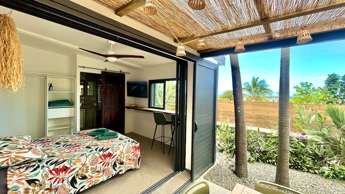 Le studio de 24m2 + son patio de 16m2 est niché sur les hauteurs de Saint-Denis à 200 m d'altitude, dans un environnement calme et paisible. Le studio est mitoyen à la résidence principale et à une autre dépendance louée en airbnb. La piscine et les transats sont partagés avec les autres locataires et nous même. Vous serez à mi chemin entre l'aéroport et le centre ville de Saint-Denis (6 km/15minutes).