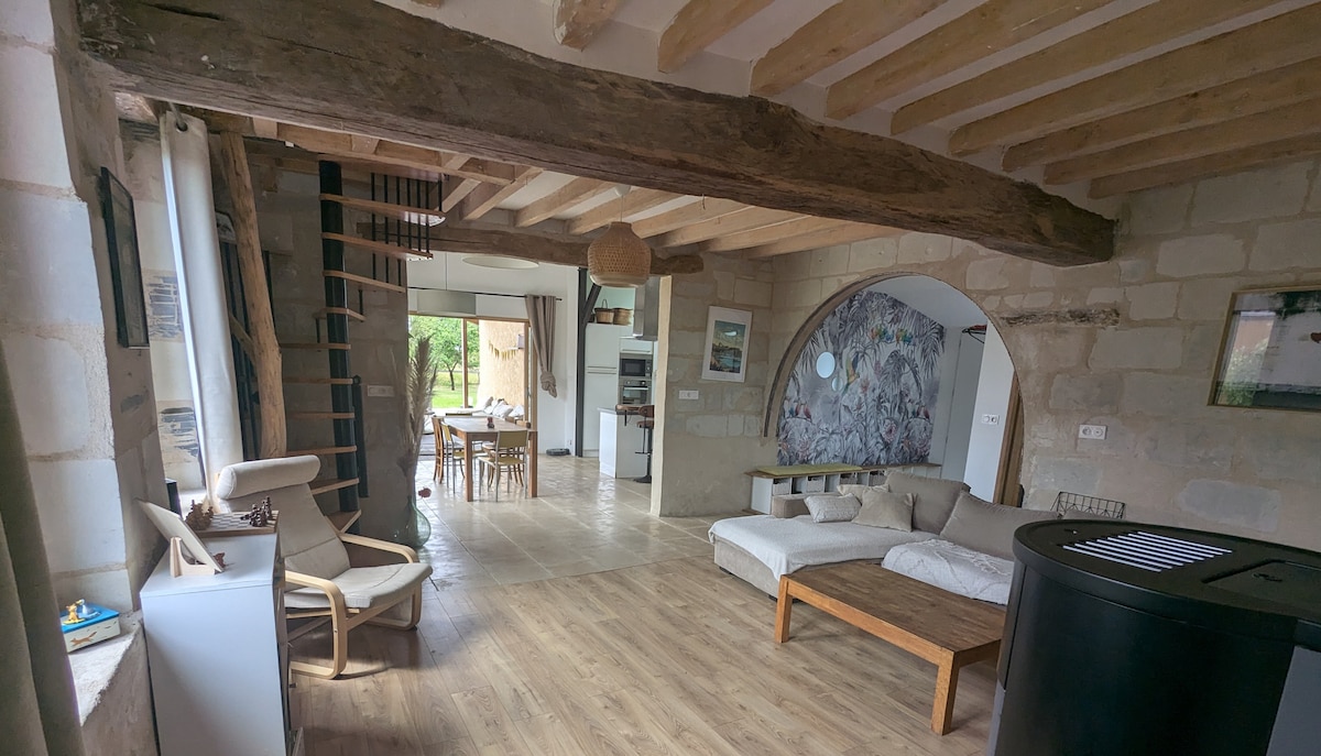 Gîte de charme avec cheminée classé 3 étoiles avec un grand jardin fleuri et boisé de 1200 m2. Sentiers GR devant la maison, le gîte est idéalement situé entre ANGERS et SAUMUR. Venez faire une halte bucolique dans notre jolie gîte du 16eme siècle, entièrement restauré avec ses pierres apparentes. Il est situé dans un village des bords de Loire classé « village de caractère ». De la maison, à pieds ou à vélo, découvrez les bords de Loire, le vignoble, les forêts de chênes et châtaigniers.