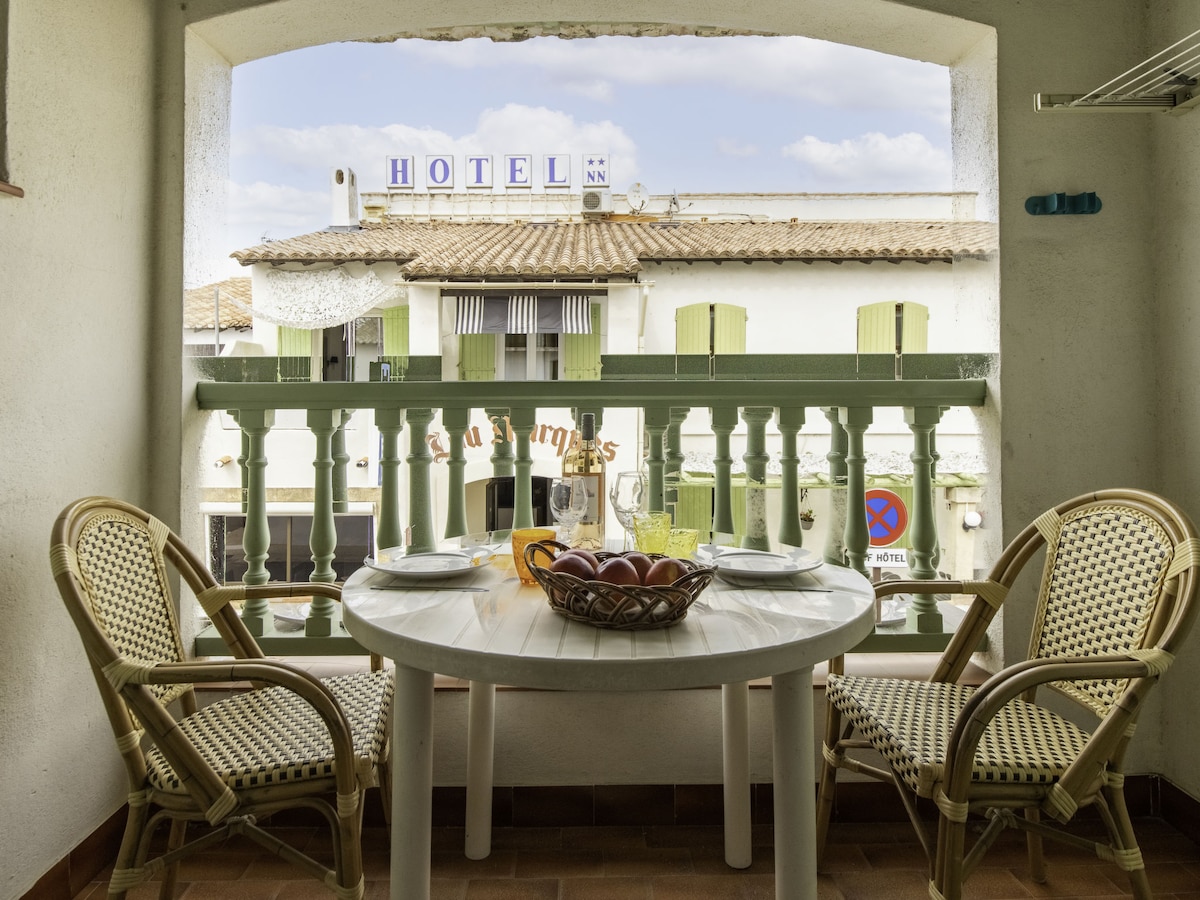 All discounts are already included, please go ahead and book the property if your travel dates are available. Below please see all the listing details "Le Soleil Camarguais", 2-room apartment 50 m2 on 1st floor. Simple and practical furnishings: 2 rooms, each room with 1 french bed (140 cm, length 190 cm). Exit to the balcony. Kitchen-/living room (oven, 4 ceramic glass hob hotplates, toaster, kettle, microwave, freezer, electric coffee machine) with dining table. Shower/WC.