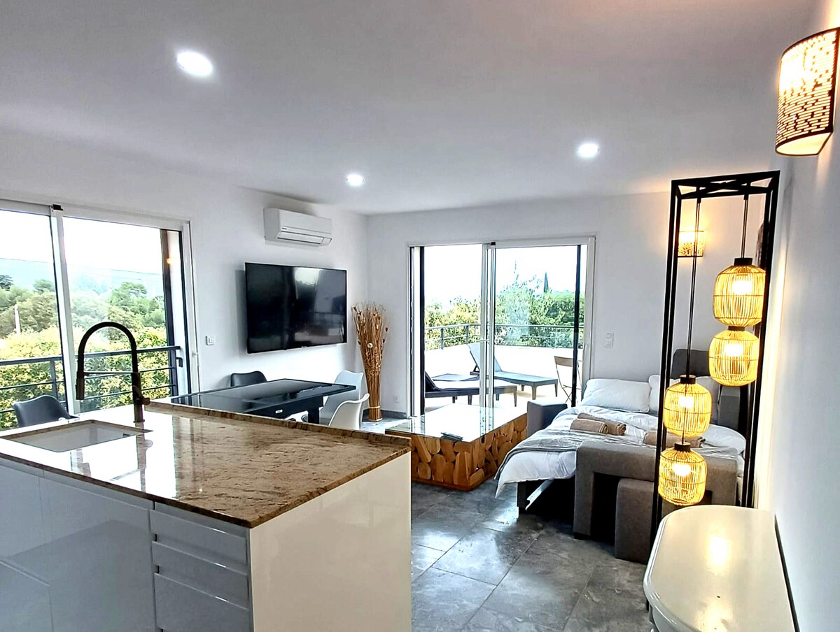 superbe appartement avec une vue à couper le souffle sur la mer..Au 1er étage d'une résidence avec place de parking et gardien.Une entrée par la mer, une par la ville,Portail automatique. Gare à moins de 5mn à pieds le port à 2 pas. marché le dimanche.superbe corniche pour les sportifs et les randonneurs. Terrasse de 36m2,toute équipée avec plancha.2 chambres une avec lit 160×200 à l étage avec rangements, la deuxième lit en 140×190 Salle d eau avec grande douche et WC Cuisine équipée