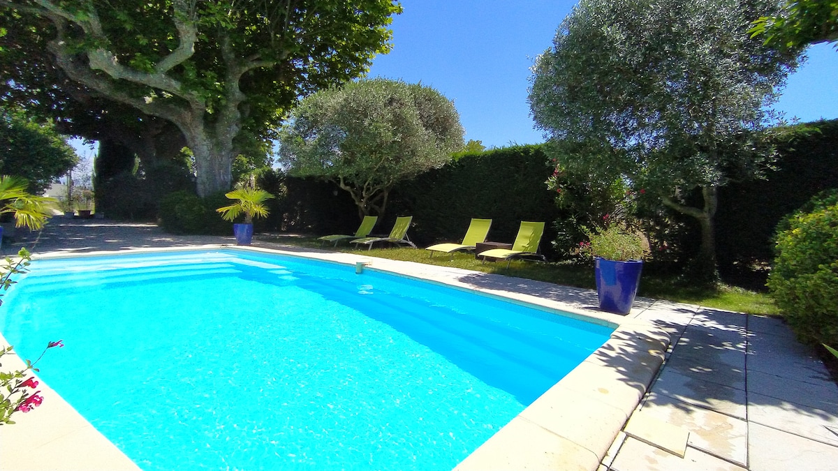 Maison indépendante(40 m2) dans une propriété de 4000 m2 très arboré. Piscine 8x4 a 20 m. La maison est de plain pied, toute équipée, WIFI fibre individuelle . Elle donnent sur le jardin magnifique en toute saison composé des énormes chênes, oliviers, fleurs. Place pour la voiture. Le tout est situé dans la zone verte: 20min à pieds de la gare, 15min du Village de Marques, Stadium Miramas Métropole et 10 min du Golf