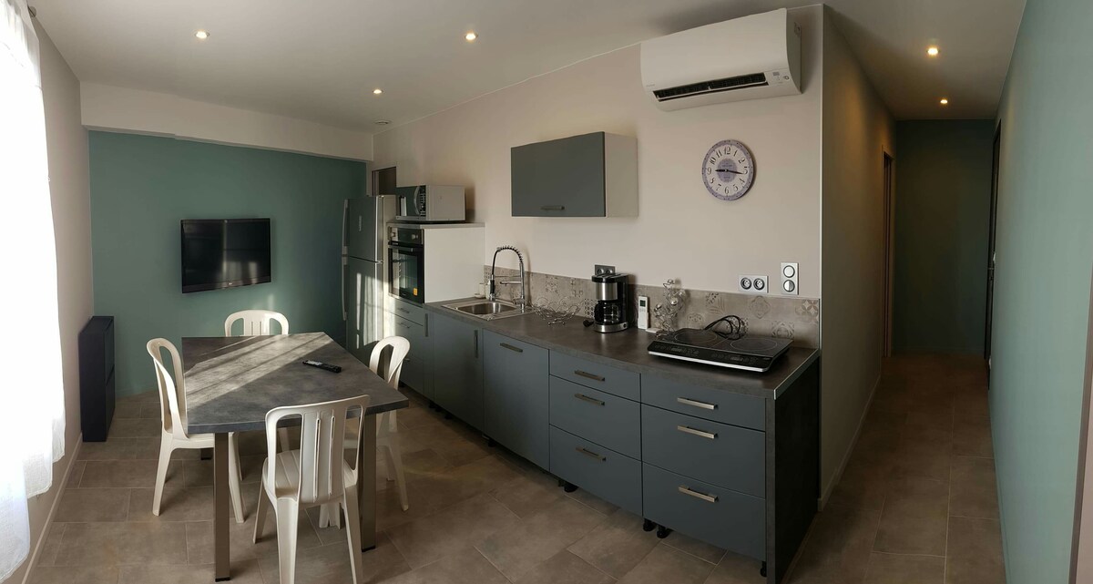 Appartement individuel très chaleureux au premier étage d'une villa comprenant une cuisine équipée avec four micro onde et traditionnel, lave vaisselle, grille pain et cafetière. Petit salon avec bézed et table basse, chambre avec lit double, SDB avec wc, douche et lave linge. Draps, oreillers, serviettes, torchons, matériels de plage fourni. Équipé de Fer à repasser et sèche cheveux. Nous habitons la maison mitoyenne, nous serons sur place pour la remise des clés ou en cas de problème.