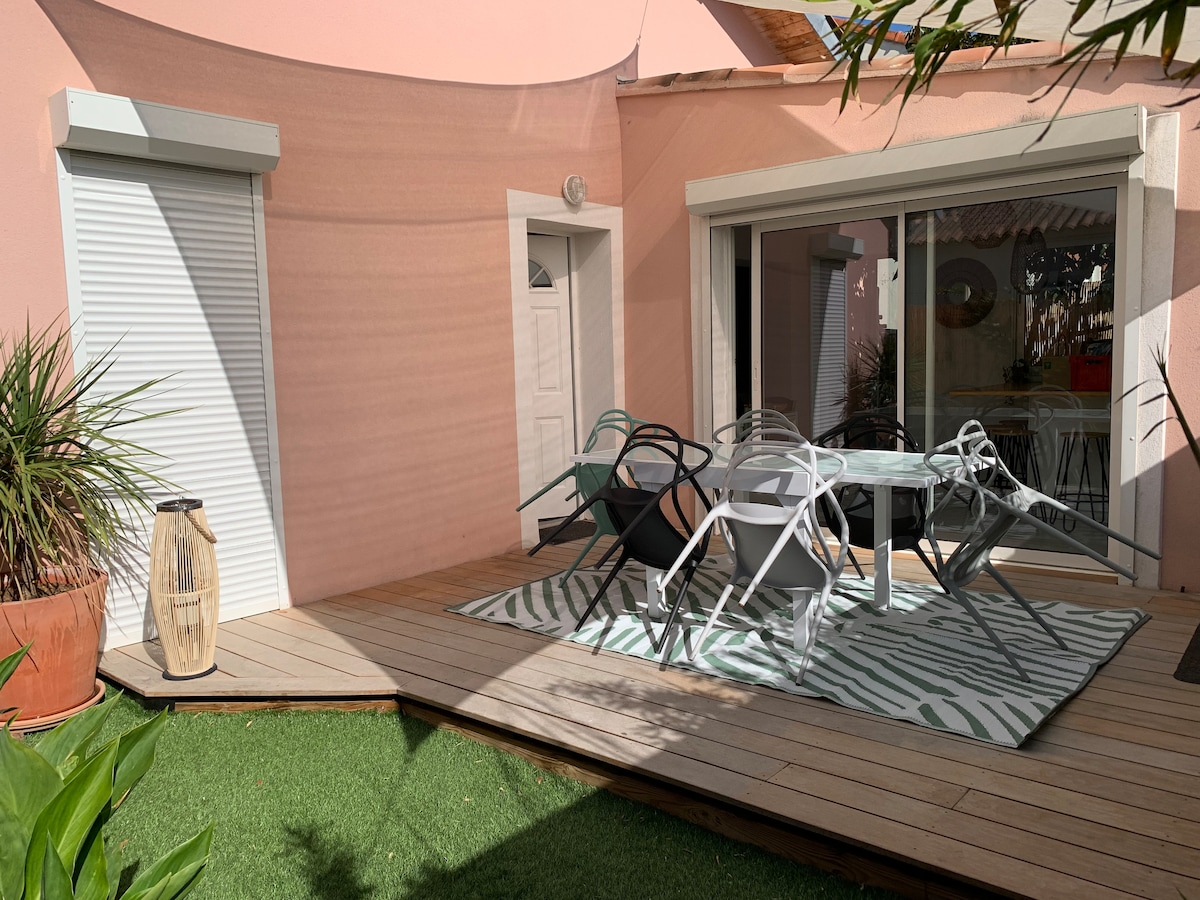 Maison individuelle de deux pieces de belles dimensions, accueillante avec un jardin privatif arbore. Grande terrasse en bois. Elle est située au coeur de la Provence et a moins de 50 pas du bord de mer, dans un quartier residentiel et calme, proche du centre ville Arrivée autonome Fibre et climatisation 2 adultes seulement, accompagnés de 1 ou 2 enfants Classement ministériel 3 étoiles dans la catégorie meublés de tourisme attribué par Provence Tourisme