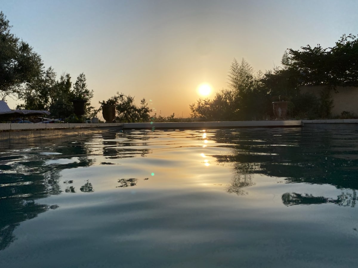 Au Mas des Ecoliers: chambre charmante avec vue sur le jardin et la piscine. Lit double au confort haut de gamme, salle de bain privative avec douche à l’italienne. Décoration soignée mêlant charme et authenticité. Accès aux espaces partagés du Mas : piscine, jardin, séjour, cuisine. Idéalement situé entre Avignon et Saint-Rémy-de-Provence, au calme, à proximité de nombreux villages provençaux, sentiers et sites culturels.