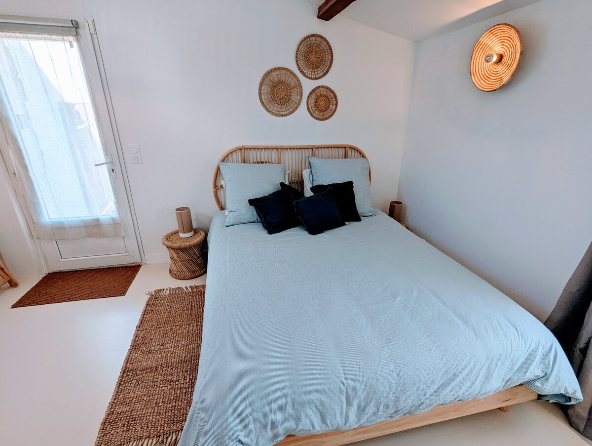 Agréable appartement climatisé comprenant une chambre avec grand lit(160) , une salle de bain avec douche italienne, lavabo,toilette, et machine à laver . Une grande pièce à vivre avec cuisine équipée ( four, micro onde , plaque de cuisson, frigo, lave vaisselle , grille pain , bouilloire , cafetière) , un coin salon avec 1 canapé et télévision , ainsi qu'un lit penderie mural ( 2 places). A l'extérieur : une terrasse privative avec salon de jardin , barbecue , transat et parasol .