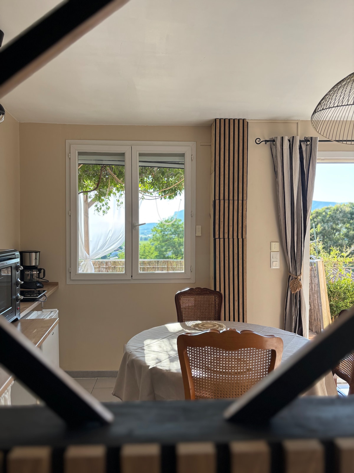 logement indépendante pour 2 personnes plein pied avec salle de bain privative, lit largeur 160. Cuisine contiguë équipée d'un micro-onde, d'une cafetière Senseo, d'un frigo, plaque chauffante, vaisselle et machine à laver. La machine à laver est aussi utilisé par la famille. La cuisine est réservée aux hôtes. A votre disposition le jardin arboré, pelouse, piscine, sans vis à vis, calme, en pleine nature, face à la montagne Sainte Victoire.