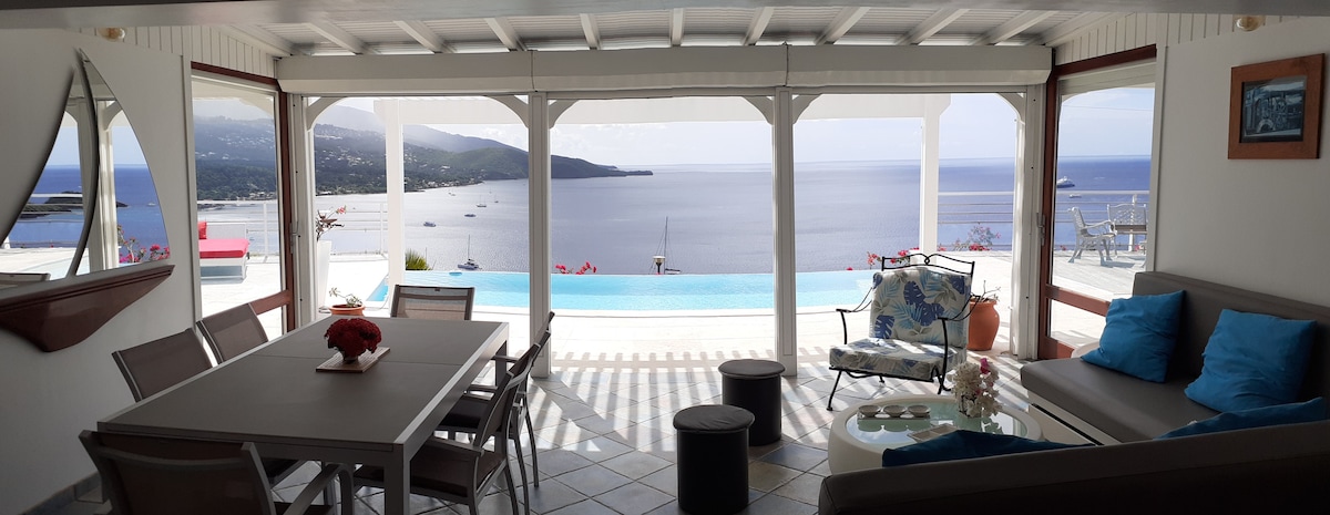 Nestled on a natural view point overlooking the Caribbean Sea, the 5-star Villa Blue Moon is one of the exceptional villas offered by *Blue Haven Villas Guadeloupe*. Sleeps 2. - Salt-water pool just steps from the super-king-size bed facing the sea with unopposed views. - Mosquito nets on windows and bed. -Fully equipped kitchen; Nespresso, dish & clothes washer, oven... - 180° view and sea access to one of the most beautiful snorkeling spots. - snorkelling gear - Parking, a-c, BBQ, Wi-Fi