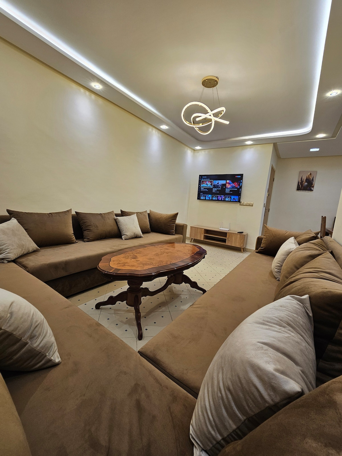 Détendez-vous dans ce logement calme et élégant. Joli appartement à deux pas du GRAND STADE de Tanger Agréable et apaisant, l’appartement se compose d’un salon élégant ensoleillé avec une chambre (lit neuf 180) La salle de bain est propre et fonctionnelle Parfaitement équipé, calme et imprégné d'une ambiance cocooning, ce sera le point de chute idéal des voyageurs d’affaires et d’agrément