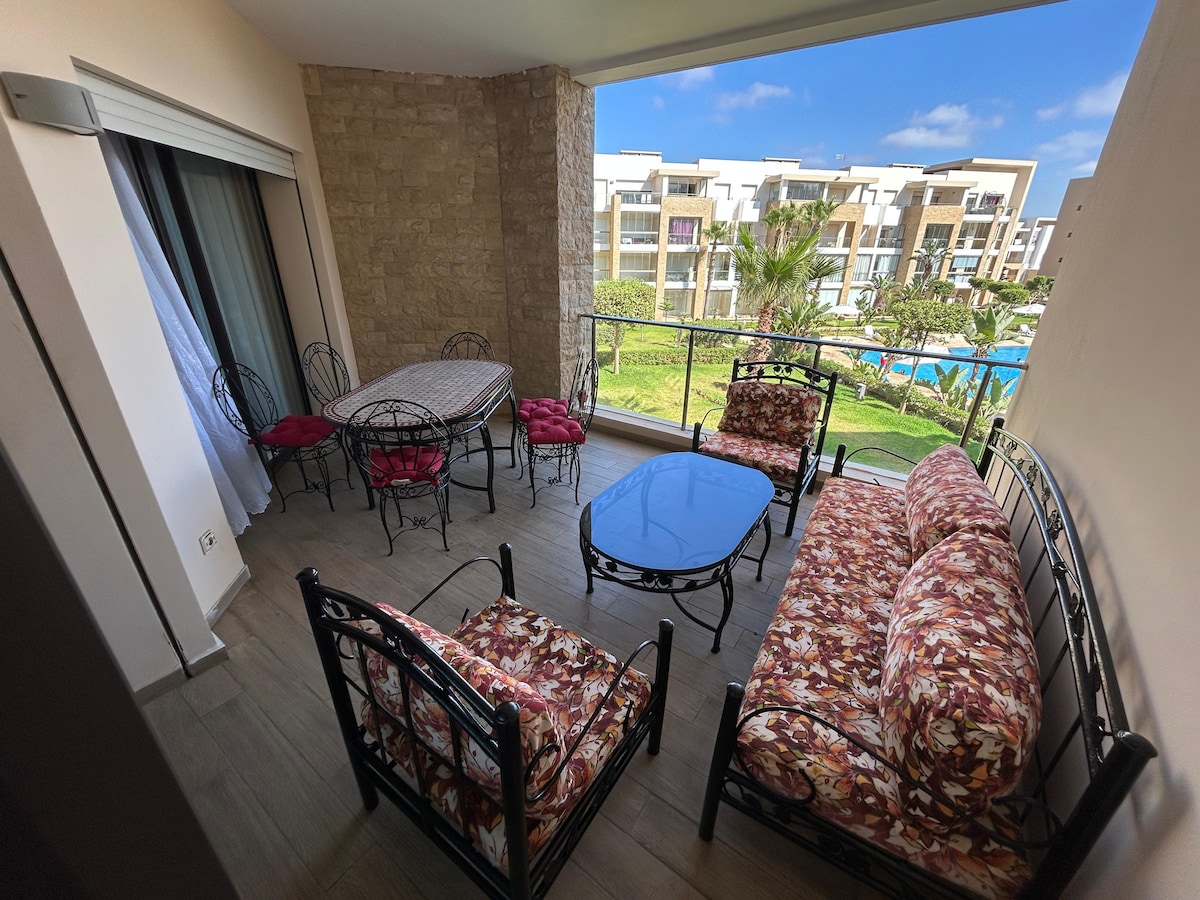 Magnifique appartement en front de mer dans une résidence sécurisée avec piscine situé à Prestigia- Plage des Nations à seulement 20 minutes de Rabat. Situé au 1er étage de l immeuble (avec ascenseur) l appartement mesure environ 105 m2 et se compose de la manière suivante: entrée sur séjour / salon avec cheminée et terrasse, deux chambres (une chambre parentale avec SDB privative, balcon et vue mer, une chambre twin), une autre salle de bain, cuisine équipée. Vue panoramique sur l'océan