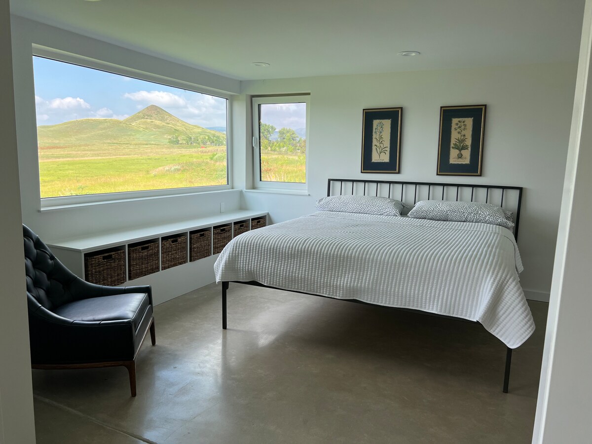 Haystack House located on ZimRidge Farm is a 9 acre organic farm with 360 views of the front range. King Apt is located on the lower level of the home with a private entrance, parking space and patio. Minutes from trails, 5 miles West of Niwot. Half way between Boulder & Longmont . A perfect spot for the weary business traveler, CU parent, hikers or travelling nurses. No smoking, vaping, or drug use within 5 miles. No children, pond not fenced. No pets as we are a certified organic farm.