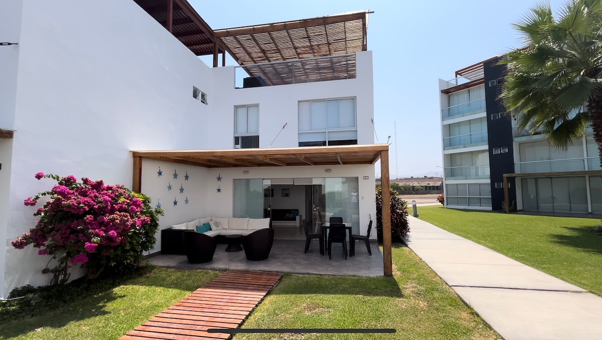 Disfruta de la tranquilidad de una acogedora casa en primera línea de playa con vistas increíbles y todo lo necesario para una estadía inolvidable. Estamos en el kilómetro 101.5 de la Panamericana Sur, a solo 5 minutos del Boulevard de Asia. El condominio ofrece: Vigilancia 24/7 para tu seguridad y tranquilidad. 4 piscinas para adultos y niños (2 de ellas a pocos pasos de la casa). Market, restaurante y bares cerca a piscinas. Club house, canchas deportivas y sombrillas en piscina y playa.