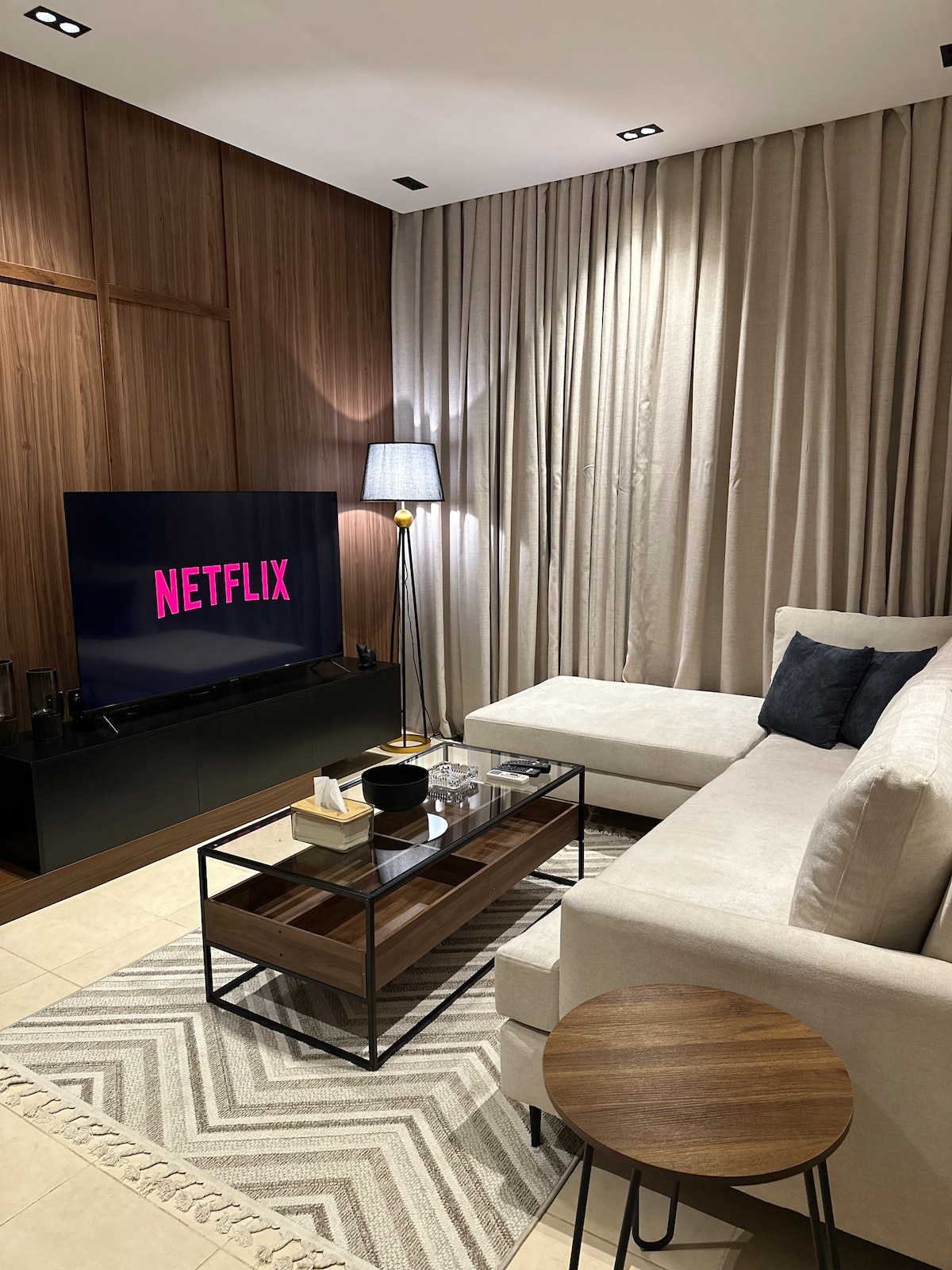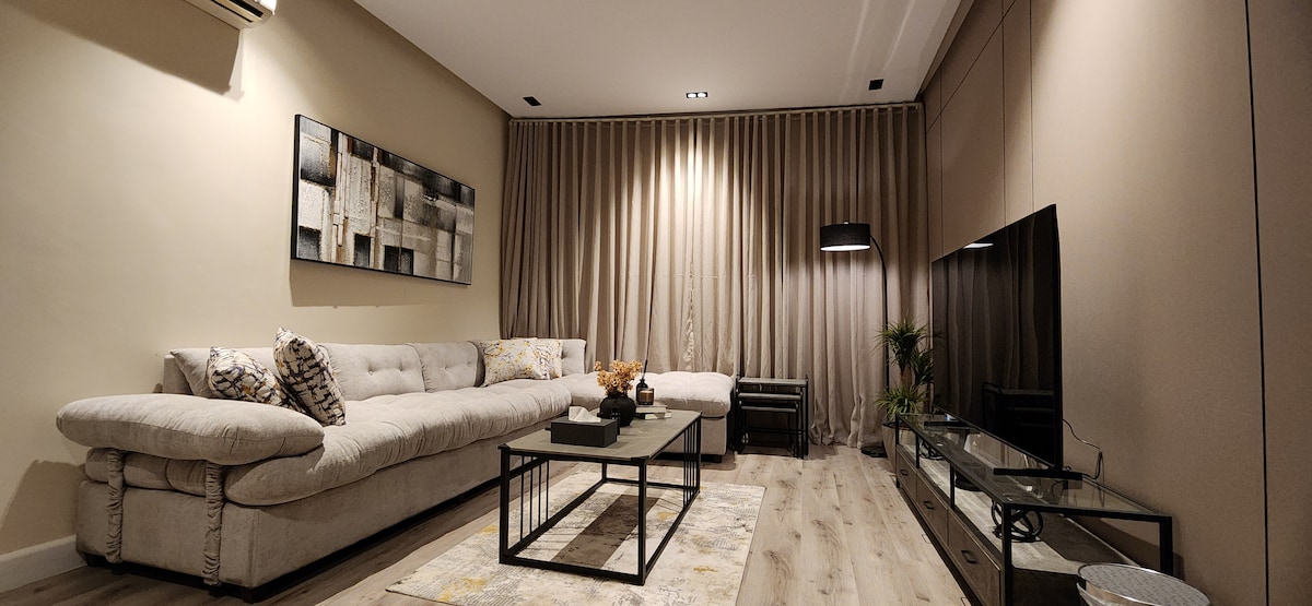 A luxury apartment next to Riyadh Season Boulevard, Hometel Residence building With a private external entrance and self-entry, consists -A living area with a billiard table, aesthetic natural plantings, a smart TV screen, a dining hall, a kitchen, and a guest bathroom, Outdoor session -kitchen (oven/ refrigerator/ microwave/ coffee maker/ kettle/ washing machine/ kitchen tools) -Master room with separate bathroom -Two bedrooms single beds, with a shared bathroom -Boulevard is just 5-minute walk