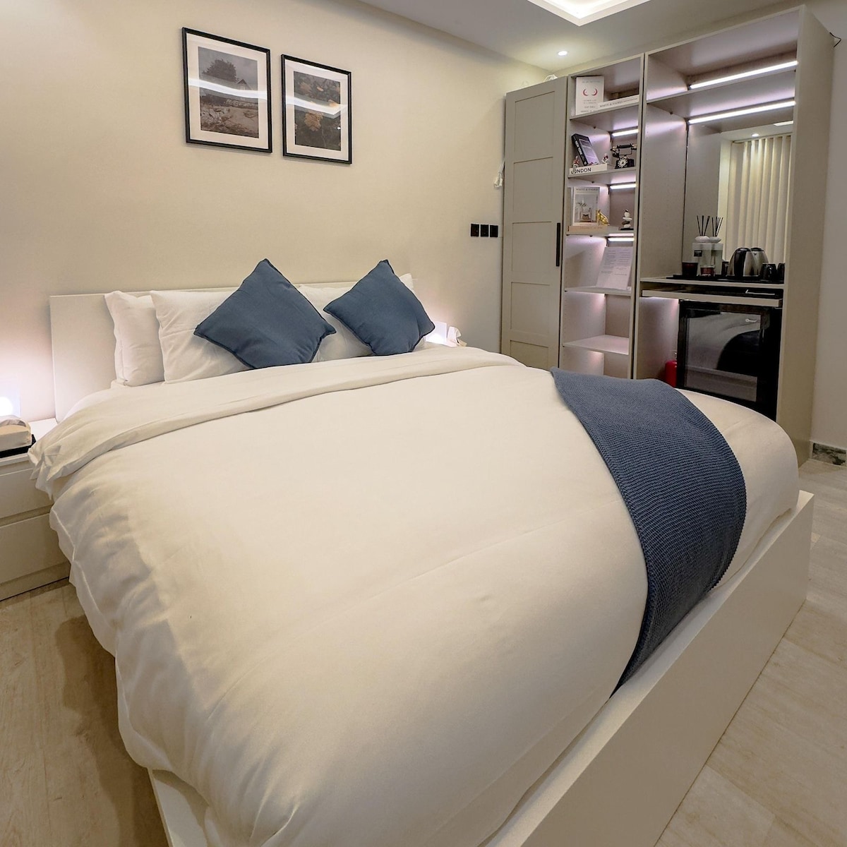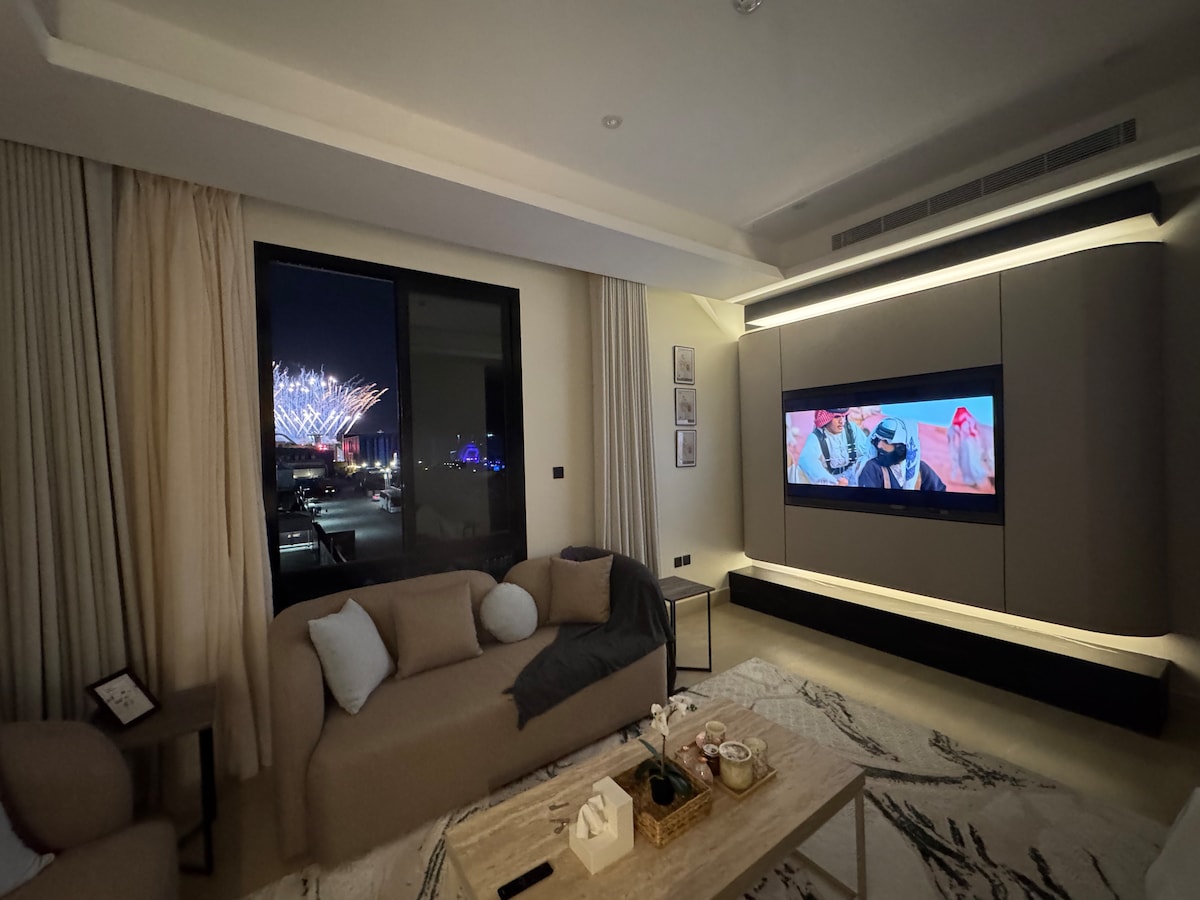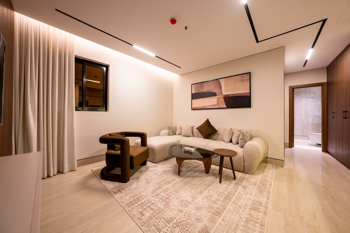 Luxury Apartment with Self-Entry consisting of a bedroom, living room, kitchen, and a fully equipped bathroom (shampoo, slippers, one-time use towels, tissues). • Stunning Boulevard view in Hittin, North Riyadh… The location is ideal, close to major events such as Riyadh Season, Diriyah Season, and all essential services like restaurants and shopping. Specifically: -Boulevard City 1 minute walking -Boulevard World 7 minutes walking -Arena Stadium 8 minutes walking -KAFD 12 minutes driving