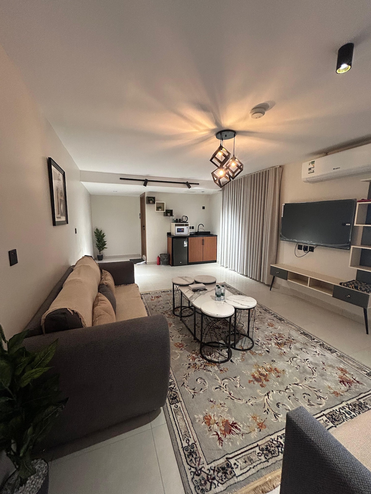 تصميم منتجع مُصغر أنيق وهادئ مع جلسة خارجية مطلة على حديقة 1- المبيت : - سرير ماستر لشخصين 2- الجلسة : - صوفا ذات تصميم عصري طويل , يساعد على الاسترخاء - تلفزيون سامسونج سمارت سنمائي كبير يدعم جميع انواع الاجهزة المحمولة ـ يحتوي على تطبيقات لمتابعة الافلام والمسلسلات والمباريات (Netflix, IPTV, YouTube) 3- انترنت مجاني 4-حديقة خارجية صغيرة بجلسة لقضاء وقت مميز 5- دواليب مطبخ بثلاجة زجاجية وغلاية شفافة 6- زرعات داخلية ك إضافة جمالية للمكان 7-يمتاز الموقع الجغرافي لقربة من جميع الاحتياجات والخدمات