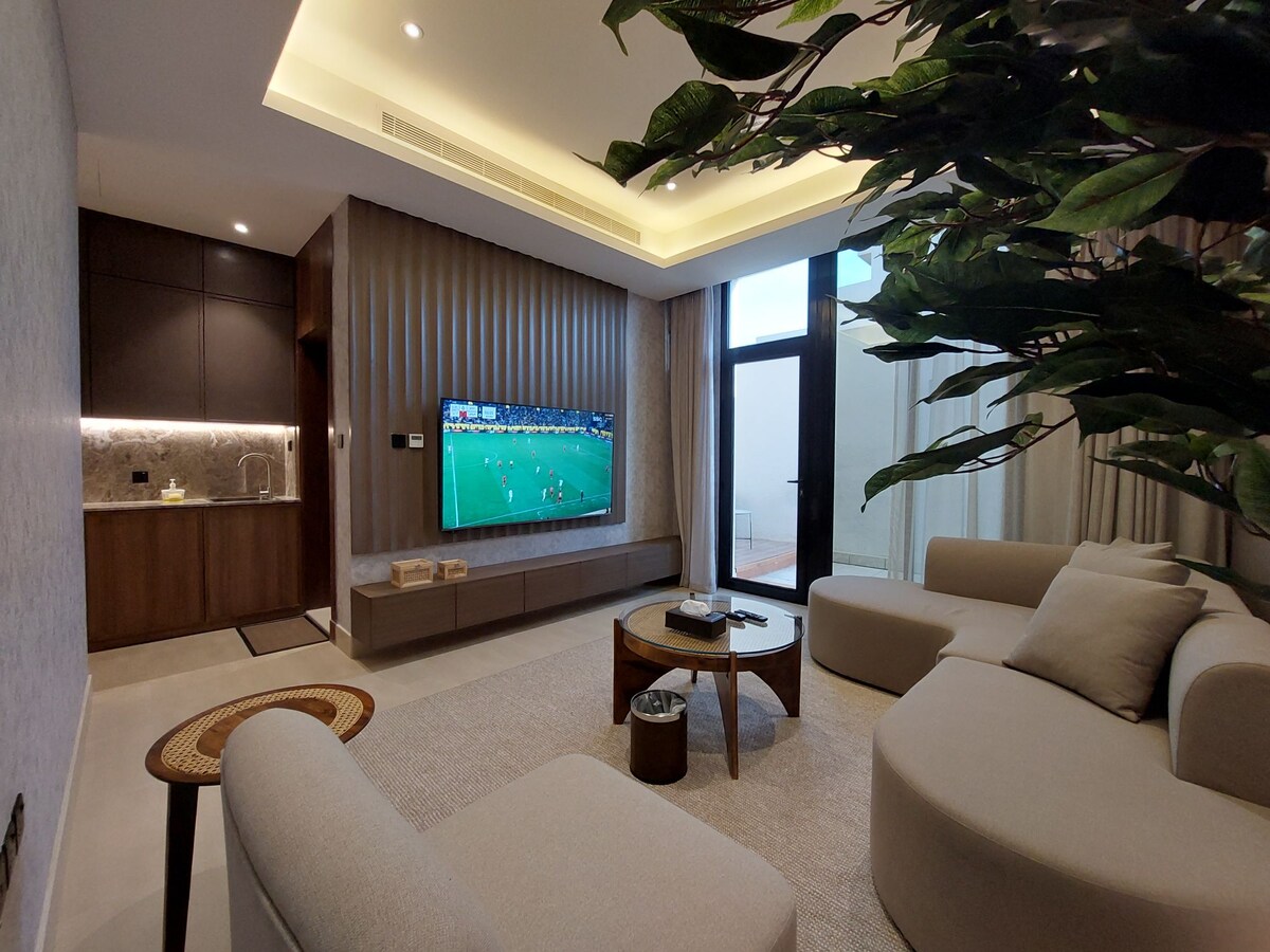 A luxury apartment next to Riyadh Season Boulevard, Hometel Residence building With a private external entrance and self-entry, consists -A living area with a billiard table, aesthetic natural plantings, a smart TV screen, a dining hall, a kitchen, and a guest bathroom, Outdoor session -kitchen (oven/ refrigerator/ microwave/ coffee maker/ kettle/ washing machine/ kitchen tools) -Master room with separate bathroom -Two bedrooms single beds, with a shared bathroom -Boulevard is just 5-minute walk