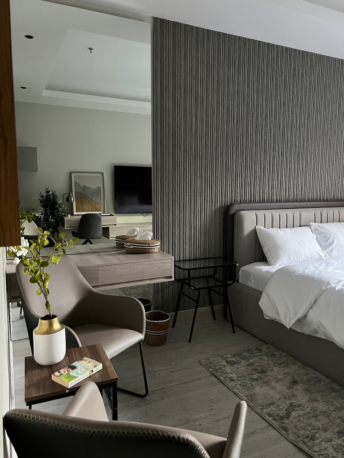 هذا المسكن الفريد له أسلوبه الخاص تقع في حي حطين شمال الرياض ذات إطلاله على بوليفارد سيتي الرياض قريبة من طريق الأمير تركي الأول ومدينة الملك عبدالله الإقتصادية KAFD والمسار الرياضي ومجمع الرياض بارك ومناطق مركزية اخرى ، صممت بألوان مريحة مؤثثة بأثاث مودرن. يوجد مطبخ ، ثلاجة صغيرة ،ميكرويف، آله للقهوة ،غلاية ،فرن كهربائي. يوجد شاشة 75 بوصة مع واي فاي 5G واشتراك شاهد للاستمتاع بمشاهدة ممتعة. تتميز بالهدوء وخصوصية تامة بدخول ذكي مع مواقف مجانية للسيارات.