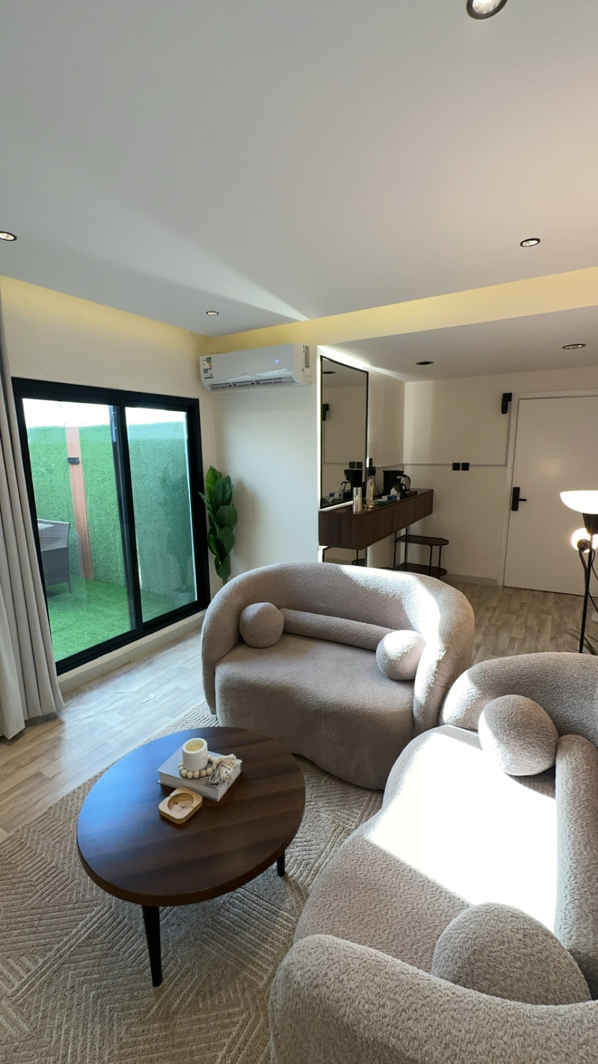 استديو أنيق ذو خصوصية تامة ودخول ذاتي ذكي بتصميم فريد ومزيج من الألوان المريحة وخدمات فندقية رائعة، كما يتميز بوجود جلسة خارجية ذات إطلالة جميلة وركن شواء خاص يتيح لك الاستمتاع بالفناء الخارجي ، بالإضافة لوجود مطبخ جانبي صغير يحوي على ثلاجة وغلاية و مايكرويف وفرن سطحي ، يقع في حي العقيق بموقع استراتيجي قريب جداً من بوليفارد الرياض والمطار والمطاعم والعديد من أماكن الفعاليات القريبة والمميزة
