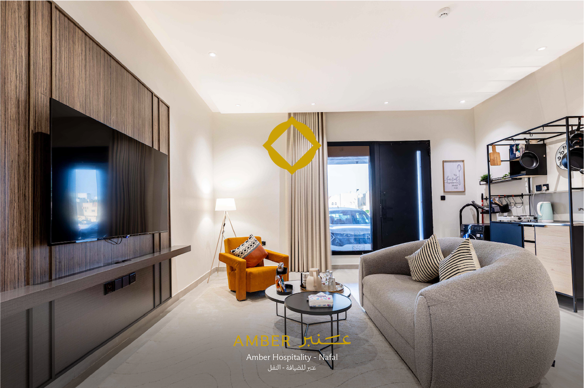A luxury apartment next to Riyadh Season Boulevard, Hometel Residence building With a private external entrance and self-entry, consists -A living area with a billiard table, aesthetic natural plantings, a smart TV screen, a dining hall, a kitchen, and a guest bathroom, Outdoor session -kitchen (oven/ refrigerator/ microwave/ coffee maker/ kettle/ washing machine/ kitchen tools) -Master room with separate bathroom -Two bedrooms single beds, with a shared bathroom -Boulevard is just 5-minute walk