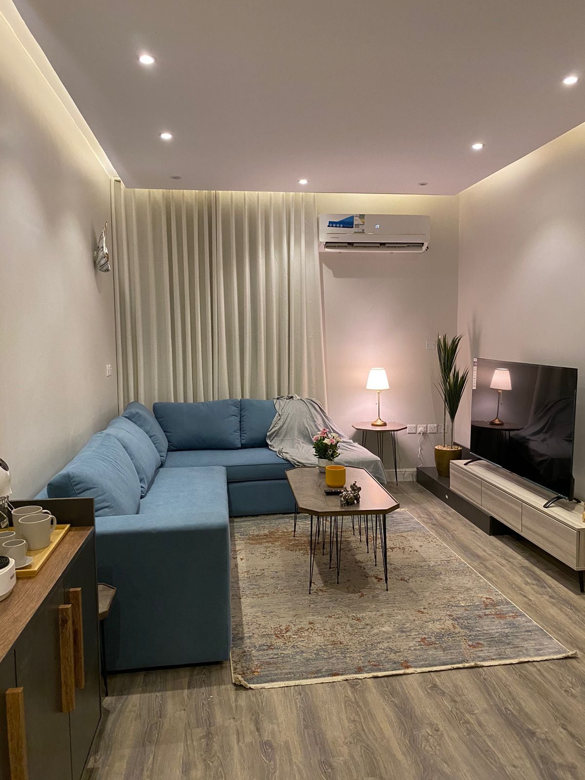 🚨🚙 Free Car Wash with every booking. Reward yourself at Irtahal Apartments, where elegance meets comfort. Enjoy a spacious and cozy lounge with a 65" TV featuring Netflix and more, perfect for those seeking a quiet retreat for studying, working, or leisure. The bedroom provides a relaxing atmosphere with soft lighting. Amenities include an American coffee machine, Turkish coffee maker, kettle, steam iron, mini fridge, and microwave