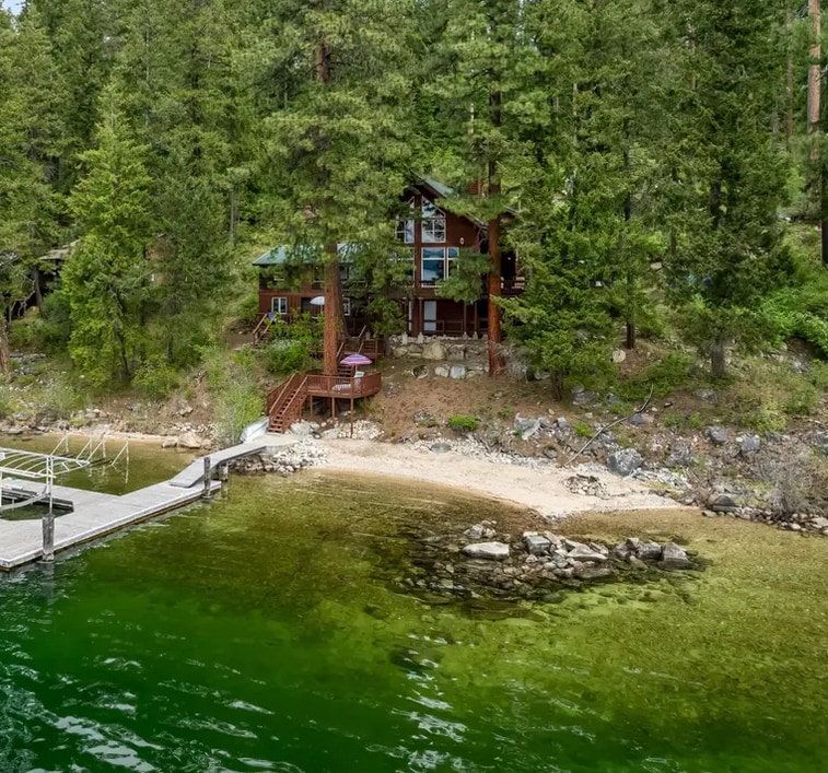 This beautiful estate on a 2-acre property at Priest Lake has it all. Built on the the north west shores of Priest Lake with views of the Twin Islands, the iconic Selkirk Mountains and has 120ft of private beach with views of Chimney rock from the waters edge. A long private driveway through a stretch of private forest leads you to this wonderful main home, detached Loft and boathouse on the beach that can sleep up to 10-12 guests. Watch video at our website: puravidapriestlake