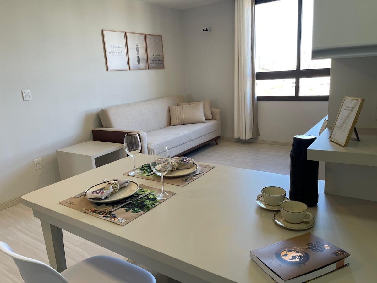 Loft 45m2 aconchegante e silencioso. No centro perto de tudo. * Cozinha completa * Estacionamento fácil acesso * Máquina lava e seca * Wifi 500mb * Smart TV 75" * 336 Canais liberados * Ar condicionado 18k btus * Passador Roupas * Espaço Home Work * Secador de cabelo * Enxoval Cama e Toalhas de banho