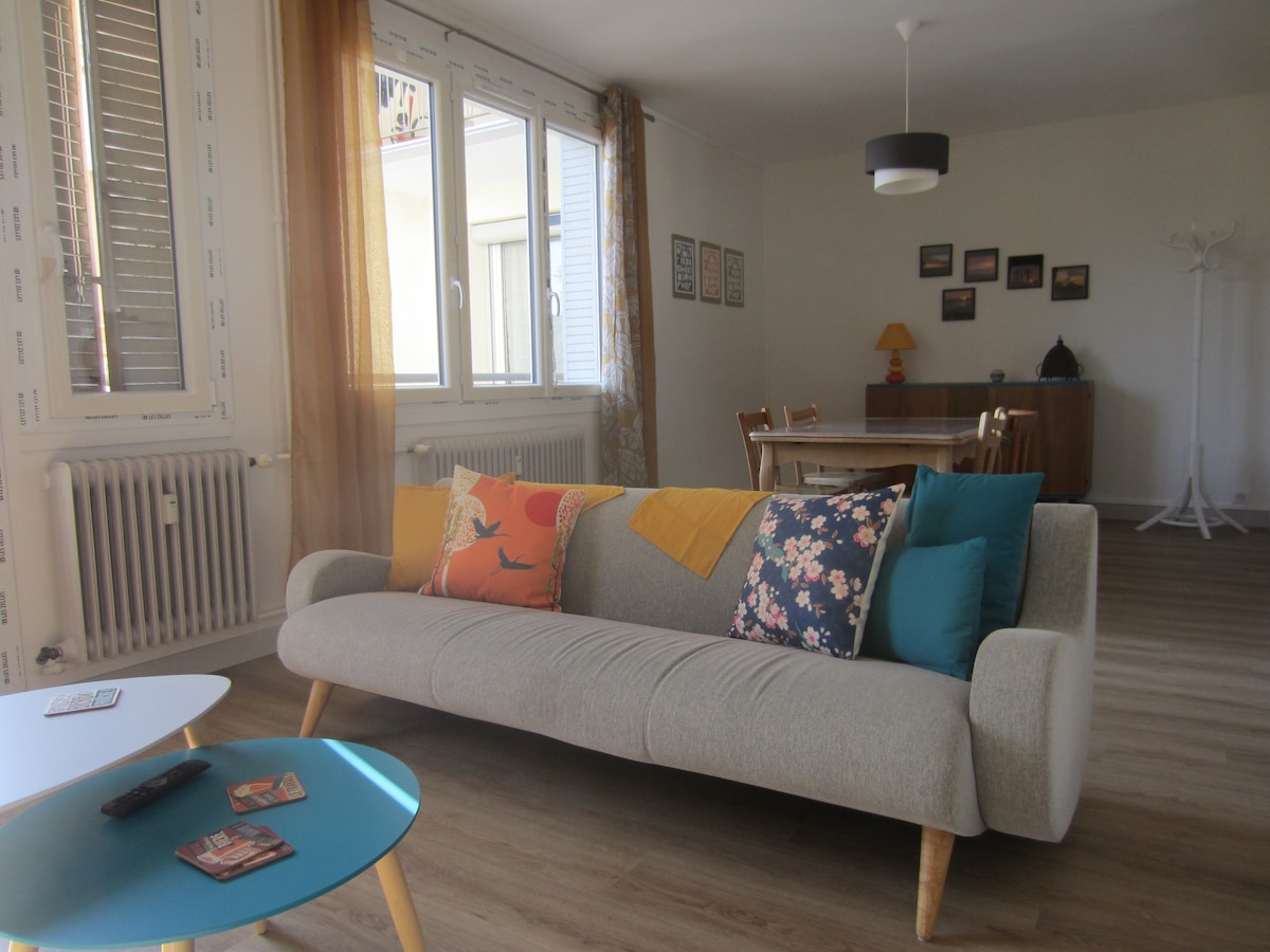 Appartement lumineux de plain pied quartier gare (à moins de 4 minutes à pied de la gare) dans maison de caractère au rez-de-chaussée donnant sur une petite cour. * centre-ville (15 minutes à pied) ou en bus (navette gratuite depuis la gare). * possibilité d'entrée avec une boîte à clés sécurisée. * Nombreux bus à proximité. * Parking GRATUIT à proximité de la maison. * station de location vélo à la gare. * WiFi et câble Ethernet