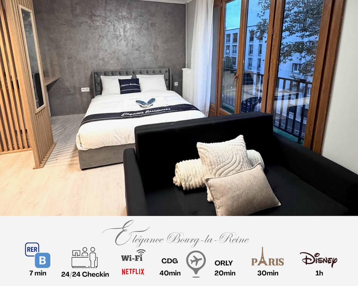 ✨ Studio cosy à Bourg-la-Reine – 7 min du 🚆 RER B, 30 min de Paris 🇫🇷 Charmant studio lumineux au 3ᵉ étage sans ascenseur, à côté du Carrefour Market et proche des commerces, cafés ☕ et restaurants 🍽️. Idéal pour une personne ou un couple, avec une déco chaleureuse . Nous personnalisons le studio pour vos occasions spéciales 💕 (lune de miel 🌹, anniversaire 🎂, etc.). 🗝️ Votre cocon romantique à deux pas de Paris !