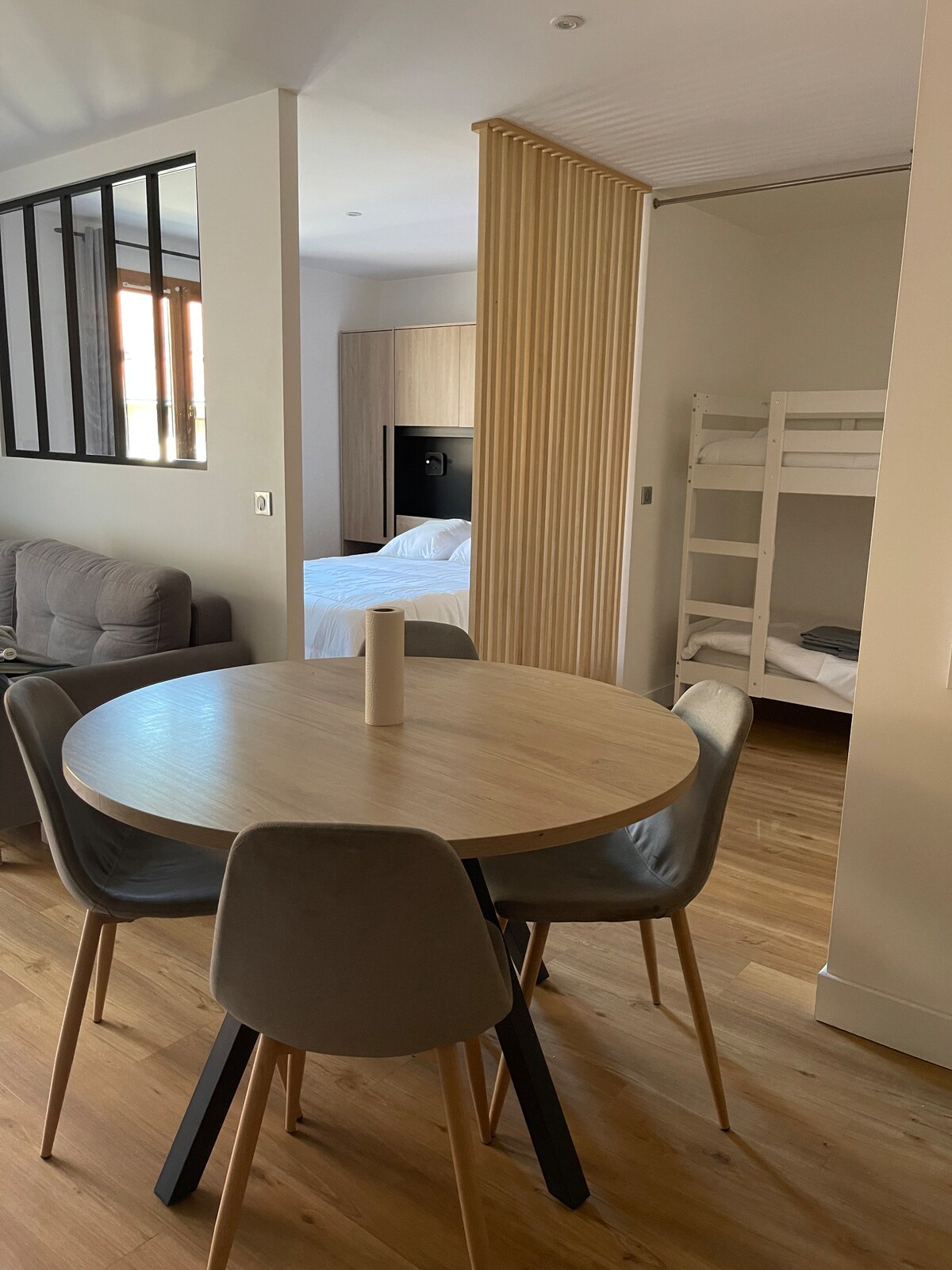 Appartement 3 pièces, 46m2. 1 chambre avec lit double avec salle de douche attenante, 1 chambre 2 lits simples (non superposés), salon avec canapé lit 2 personnes. 1 salle de bains avec baignoire. Cuisine équipée (micro onde, lave vaisselle, cafetière, four....). Lave linge et sèche linge dans la résidence (gratuits). Accès à la piscine, sauna, hammam, fitness de la résidence inclus. Linge de lit et de toilette fourni (lits faits à l'arrivée). Billard dans la résidence. Appartement très lumineux