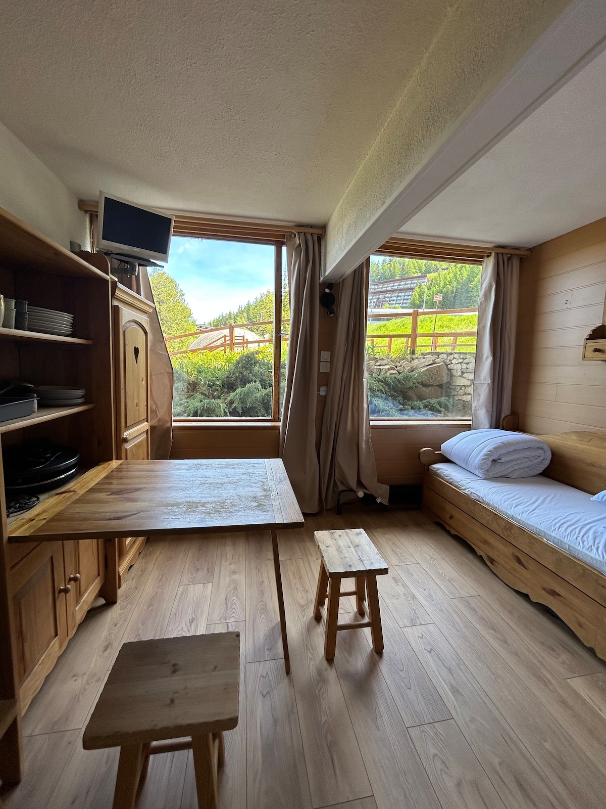Studio in the ground floor with terrasse - 17m² - Situated at 400 meters to the funicular to go to Arc 1600 and 400m to downtown. One bed in the entrance with a separate door between the entrance and the main room. One sofa bed in the main room. Wifi offered - free parking of the residence NOTE : BED LINEN AND TOWEL NOT FURNISHED IF YOU STAY LESS THAN 4 NIGHTS NOTE : Following the fire that occurred in the building in front of the studio, the residence's pool is closed this summer.