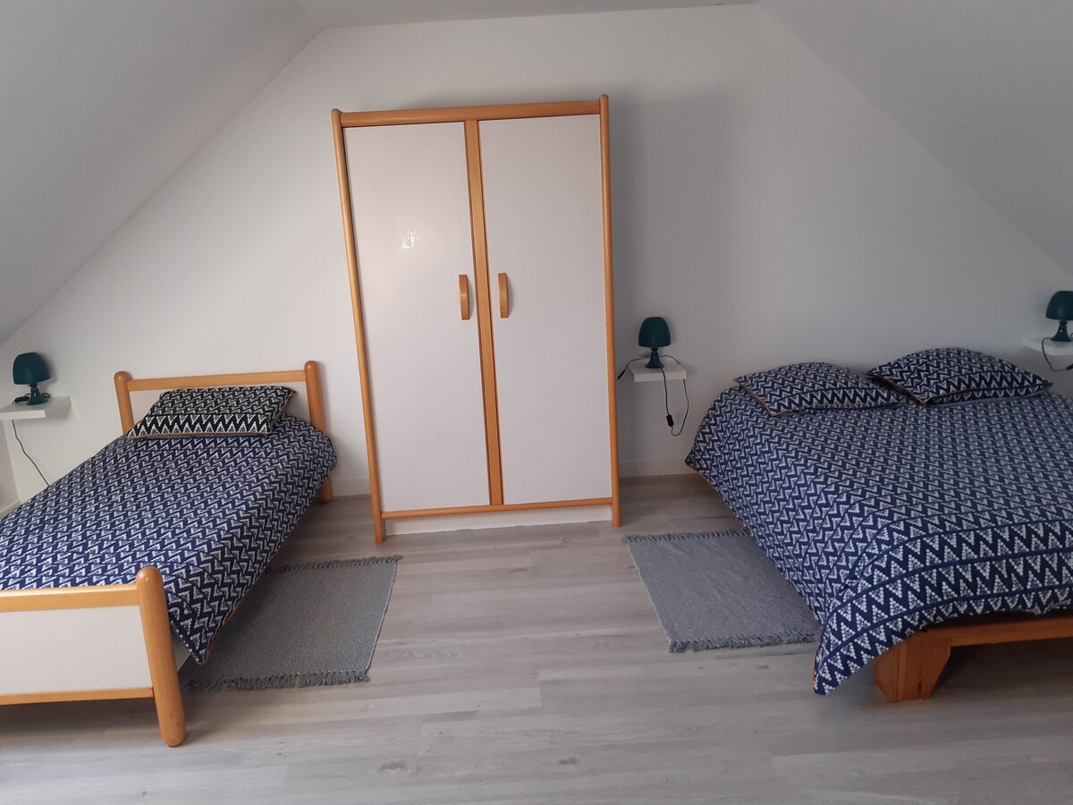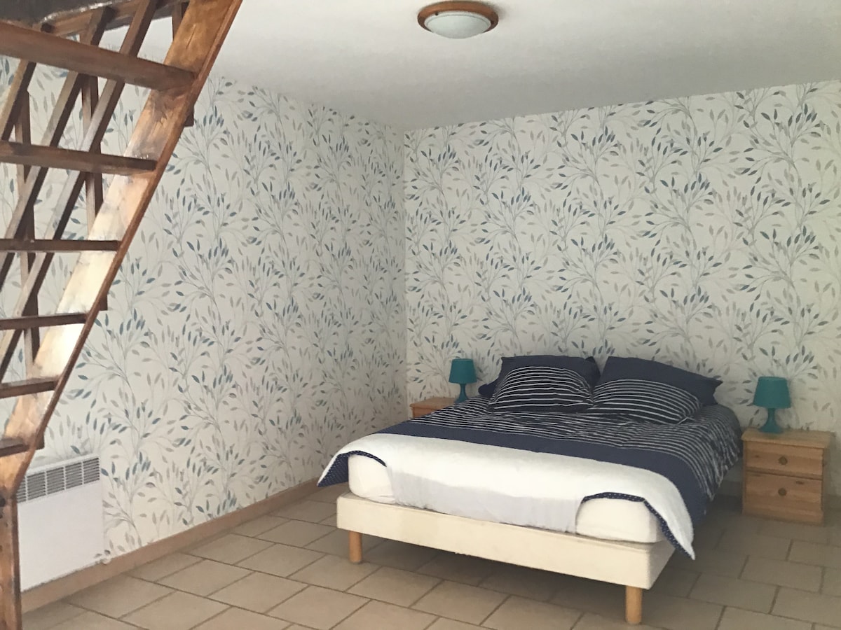 Laissez vous séduire par cette très agréable longère de 1890 entièrement rénovée. L’étage pour 2 personnes vous est entièrement réservé : - une chambre spacieuse climatisée avec frigo, micro-onde et d’une TV (Canal +, Netflix) - une pièce palière avec un billard anglais, un canapé - un salon avec deux canapés et un grand écran avec vidéoprojecteur - une salle de bain avec un sauna à votre disposition. Au delà de 2 personnes, la 2ème chambre au RDC est à votre disposition Stationnement sécurisé