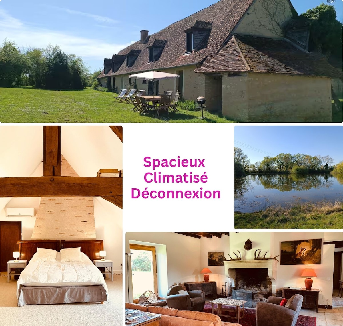 Unique sur Bourges st doulchard, logement totalement indépendant et dans un environnement calme et naturel. Du salon ou de la chambre vous êtes dans l'eau. Profitez de notre terrasse vue sur l'étang. Ce chalet est entièrement neuf et tout confort, climatisation/ chauffage,volets électriques, cuisine entièrement équipée, douche à l'italienne,grand lit de 160,canapé lit... Emplacement improbable, la campagne à la ville. Formule tout compris,draps,linge de maison,café thé eau,condiments, ménage...