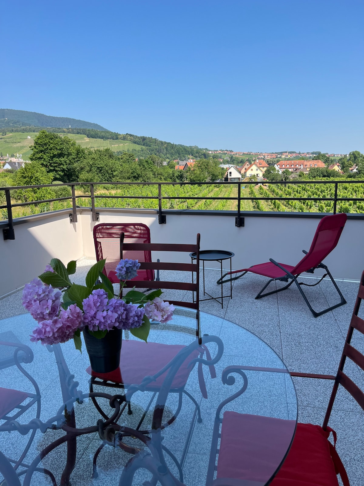 Magnifique loft triplex de 3 étages, climatisé et de 75m², situé dans une maisonnette indépendante, dans la cour viticole ZEYSSOLFF. Niveau 0 : petit salon avec TV, coin cuisine et toilettes. Premier étage : chambre ouverte sur une mezzanine vous invite à la rêverie, composée d’un lit rond de 2m de diamètre et d'une salle de bain avec douche à jets + toilettes. Second étage, sous une magnifique charpente apparente, une seconde chambre est composée de 2 lits individuels. TERRASSE PRIVÉE DE 10m².