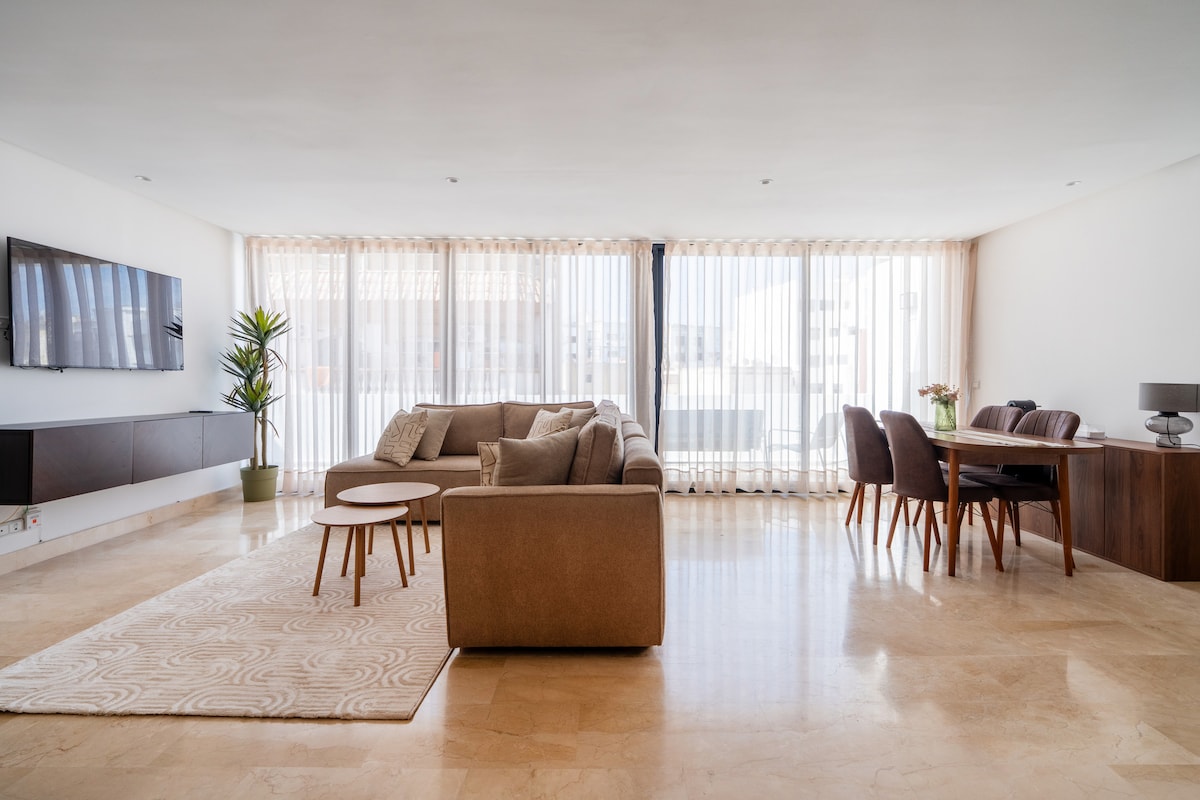 Discover this stunning one-bedroom apartment ideally located in the heart of Casablanca’s Golden Triangle . • Luxurious décor with designer furniture and a comfortable Queen-size bed • Bright and airy space with a balcony and large floor-to-ceiling windows • High-speed Wi-Fi, Netflix, fresh towels, and all essentials for a perfect stay Every detail has been carefully designed to create a warm, elegant, and comfortable atmosphere