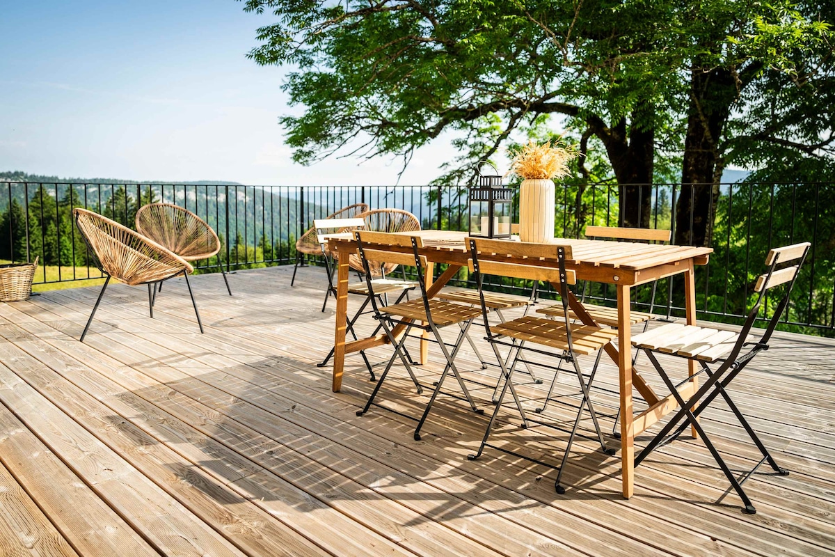 Set within a carefully renovated former farmhouse, this 90 m² duplex sleeps 4 and offers breathtaking panoramic views over the Jura valley and forest. The bright living area opens onto the terrace, bringing the landscape indoors in every season. Two upstairs bedrooms ensure peaceful nights. Surrounded by nature, just 800 m from cross-country trails and 5 minutes from alpine slopes. An elegant retreat combining comfort and fresh mountain air.