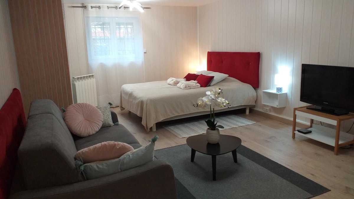 Bienvenue, notre logement dispose d'une chambre avec un lit deux personnes et possibilité d'ajouter un lit pour Bébé ou un lit de 90, possibilité également de recevoir un ou deux enfants ou ados (canapé convertible). Une cuisine aménagée (micro-ondes, bouilloire, machine senseo), un salon-s. à m., sdb avec douche, un grand jardin partagé, terrasse avec table pour des repas à l'extérieur, ... Nombreux lieux touristiques à moins de 15 kilomètres du logement. Lieux de baignade et randonnées