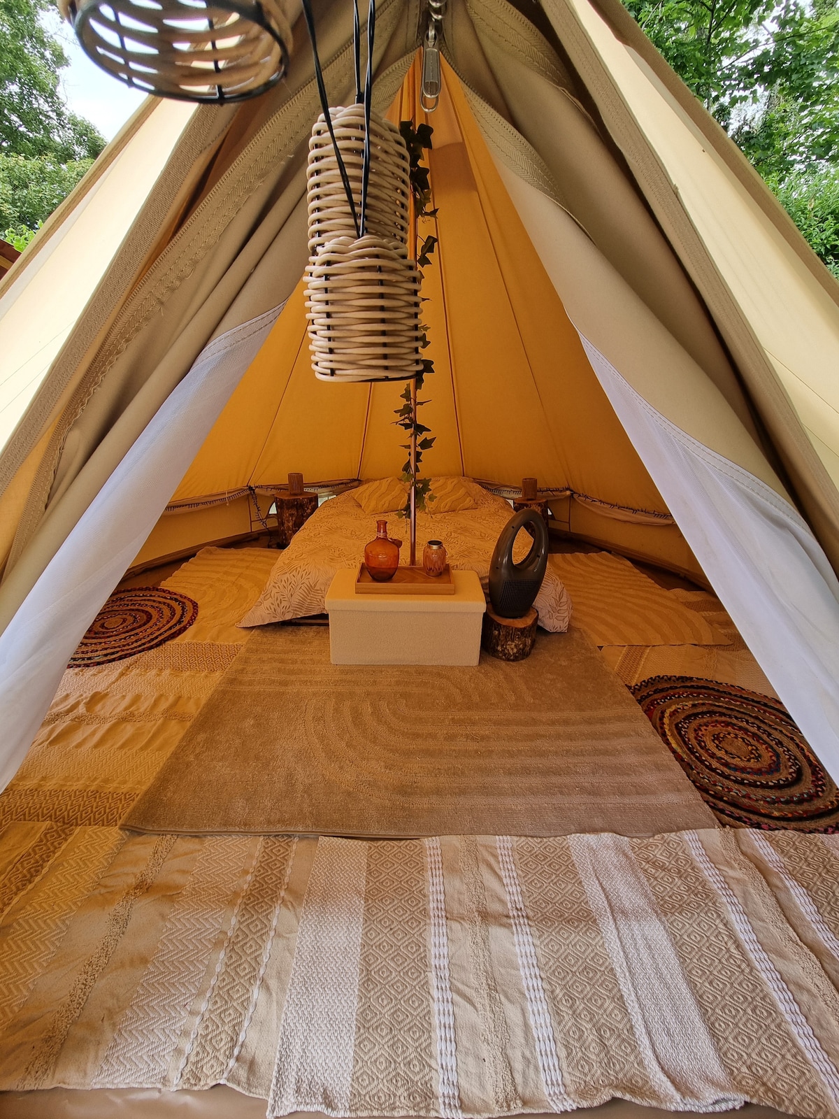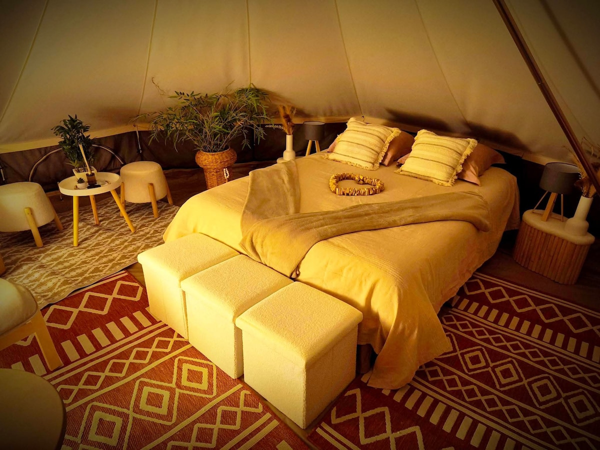 Sur une grande parcelle pour plus d'intimité, une tente de 20 M2 décorée dans un esprit zen et romantique. Jacuzzi privatif sur votre terrasse. Pour une expérience inoubliable, un braséro face au paysage champêtre pour faire griller des chamallows ( offerts) et vivre un moment romantique devant un feu sous les étoiles. Toilettes sèches sur emplacement. Salle d'eau privative à 40 mètres de la tente. Frigo avec soft drink offert. Petit déjeuner, linge de lit et de toilette, ménage sont compris