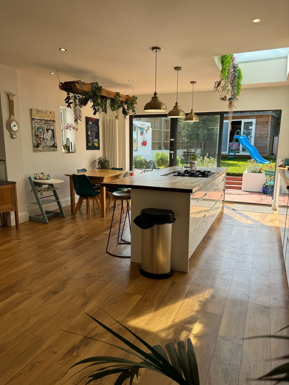 Our Guest Annex is a Studio with its own entrance, keysafe & parking infront. Upon entering the hall, there is a lounge with a sofa-daybed (with trundle), a smart TV, a kitchenette and a dining table. The kingsized zip-link bed is located at the back of the sunny room with large windows overlooking the back garden. Access to our washing machine, which is located in the main house, is available on request. Housekeeping is weekly, normally on Sundays, when your stay is 7days or longer.