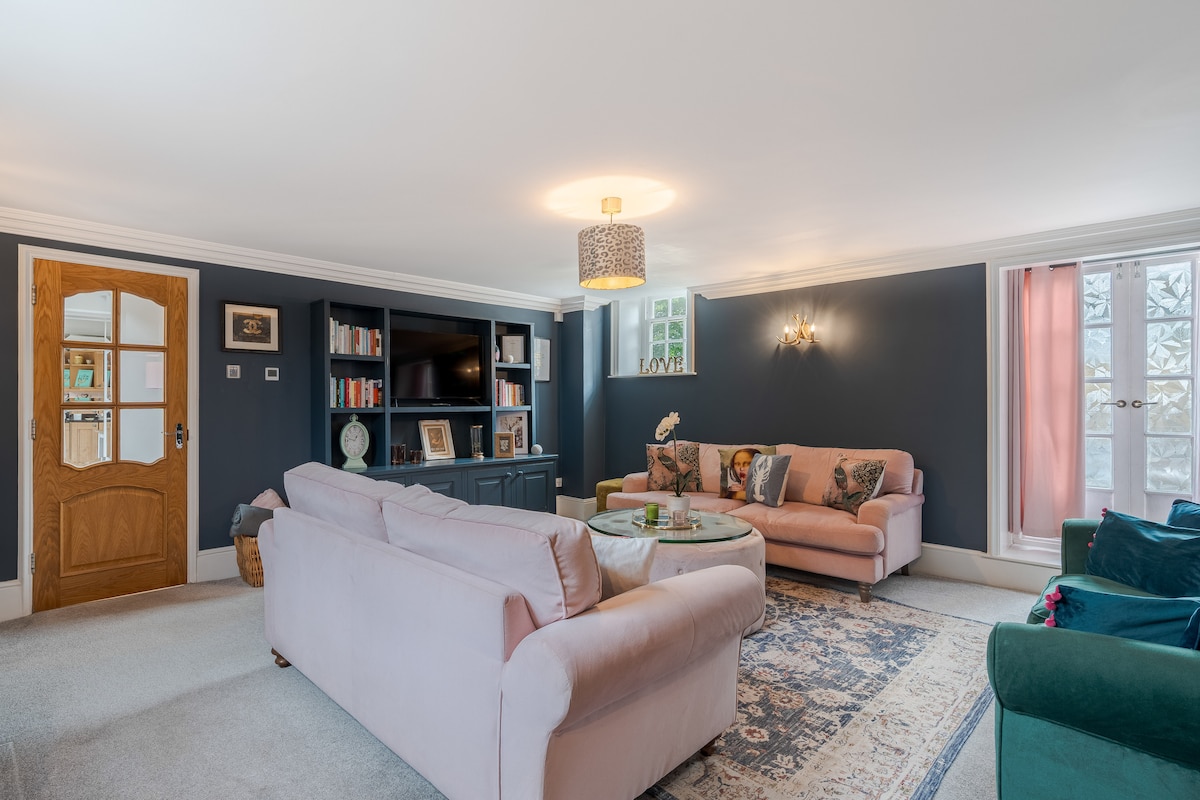 NEWLY REFURBISHED The Coach House is located within the grounds of Longham Lakes, 10 miles from Bournemouth and Poole & 2 miles from Wimborne. A Grade II listed stylish home,quirky lounge, good sized kitchen with table seating up to 8, 1 King size bedroom with day bed ,2 further double rooms. 3 bathrooms plus a loo, utility room, beautiful private garden, large outdoor dining, fire pit & parking for up to 4 cars. Hot Tub hire available and use of Games room with pool table and dart board.