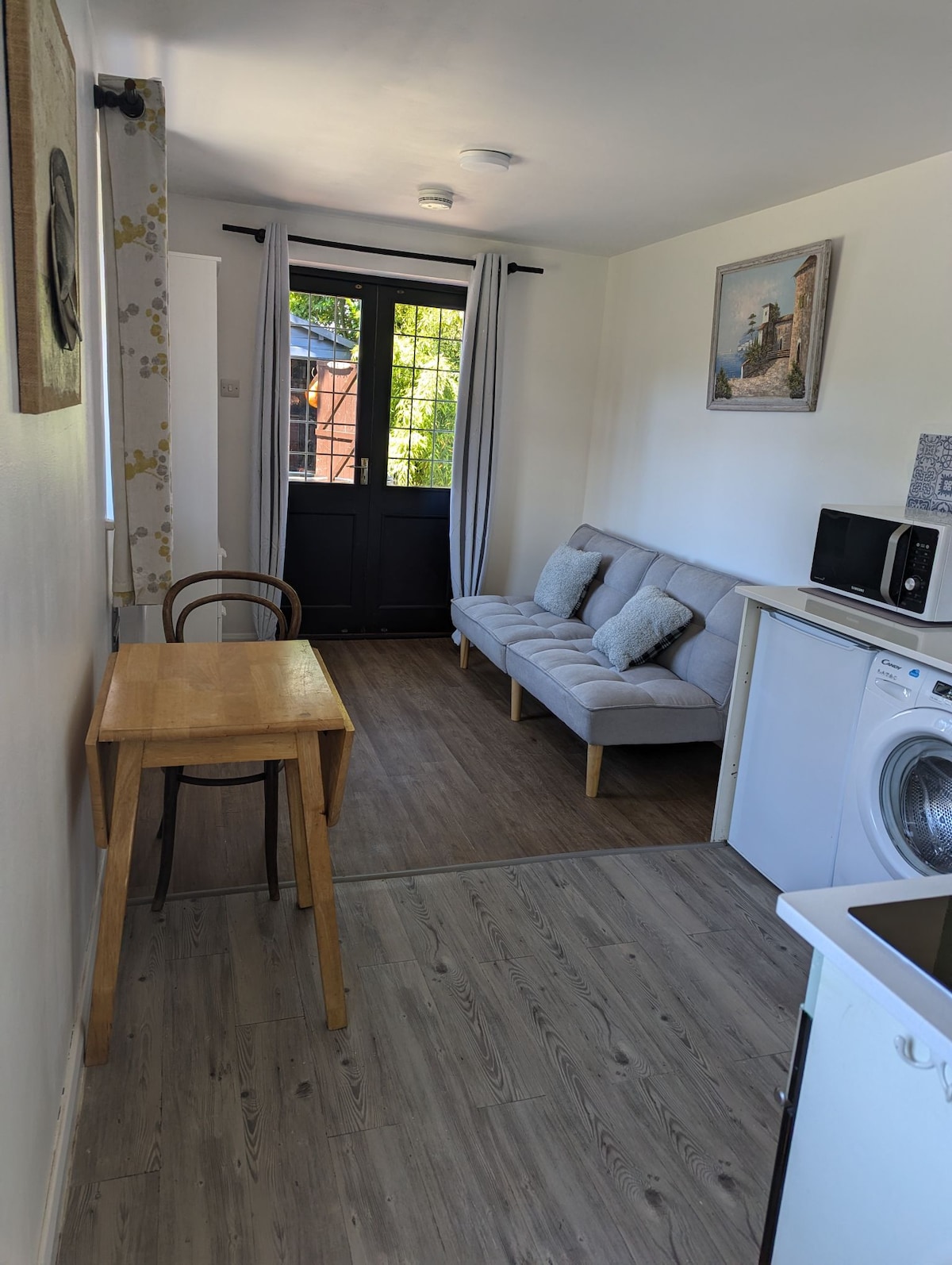 Our Guest Annex is a Studio with its own entrance, keysafe & parking infront. Upon entering the hall, there is a lounge with a sofa-daybed (with trundle), a smart TV, a kitchenette and a dining table. The kingsized zip-link bed is located at the back of the sunny room with large windows overlooking the back garden. Access to our washing machine, which is located in the main house, is available on request. Housekeeping is weekly, normally on Sundays, when your stay is 7days or longer.