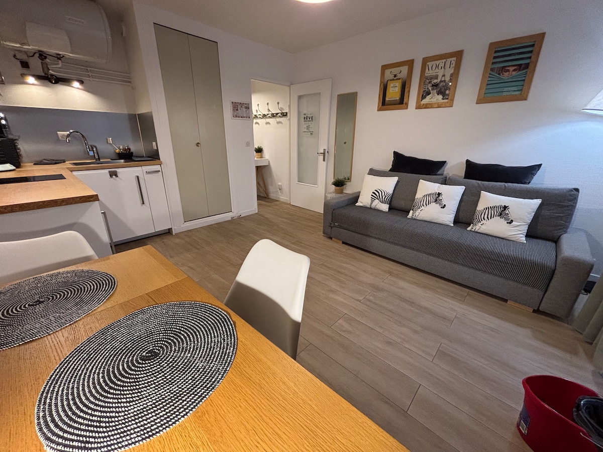 Grand studio avec une chambre séparée par une cloison vitrée; en centre -ville, dans une petite impasse calme, à 5 minutes à pieds du quartier commerçant et à 10 minutes du château. Beaucoup de charme pour ce pied à terre idéal pour les randonneurs et les amateurs d'escalade et de nature souhaitant découvrir le massif forestier de Fontainebleau. Cet appartement dispose de tout le confort: petite salle bain avec douche et toilette, kitchenette fonctionnelle, salon et chambre.