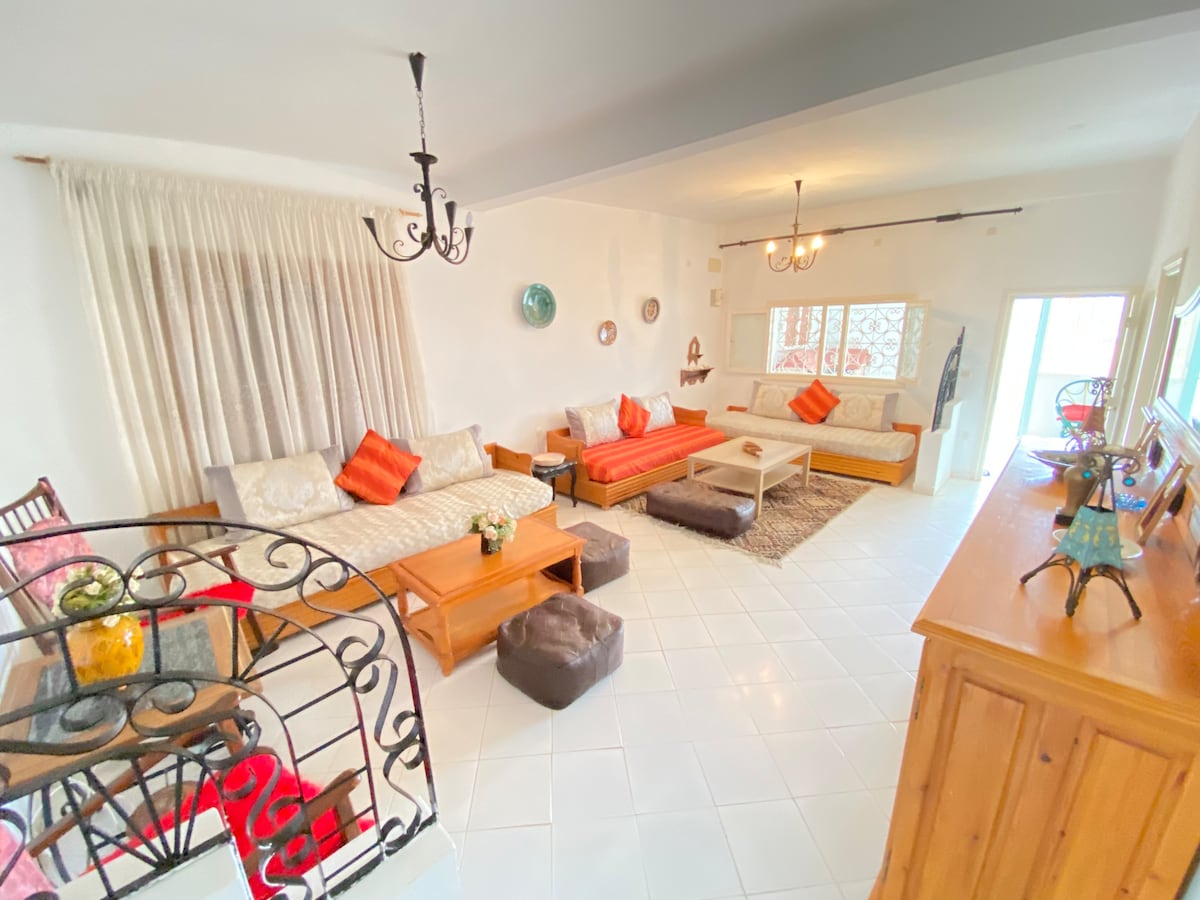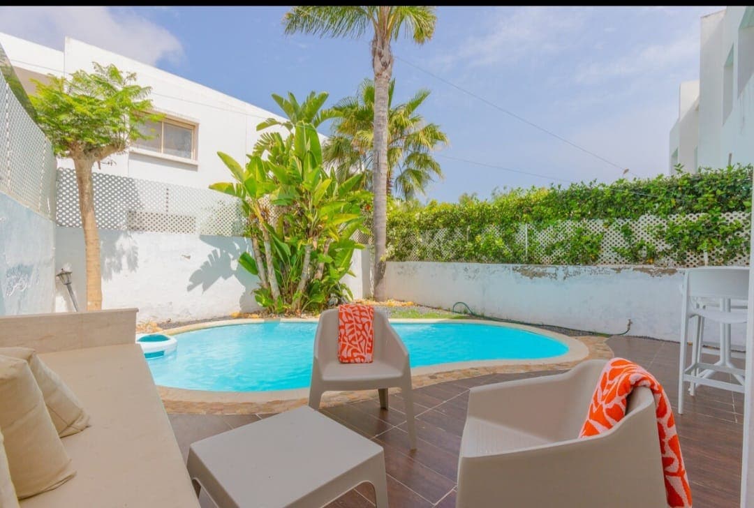 Superbe villa dans une résidence privée et sécurisée, située au centre de Dar bouazza à 2 min de la plage et collé au Carrefour Mercato. - sous-sol : cuisine équipée de tous ustensiles, four, lave vaisselle .. - 3 salons spacieux avec une salle à manger (8 chaises) - un jardin avec piscine privative et transat et une salle à manger d’extérieur - 1er étage : 4 chambres équipées avec 3 salles de bain Cette villa est destinée aux familles, touristes étrangers et couples marocains mariés.